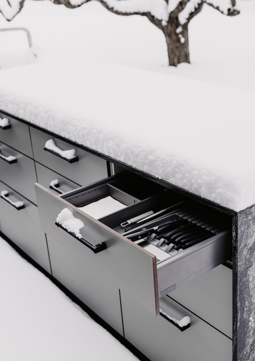Unsere wetterfesten Outdoorküchen trotzen allen Elementen und sind bereit für alle Jahreszeiten. Dank der sorgfältigen Abdichtung im Frontbereich, ist das Innenleben unserer Outdoorküchen und Outdoormöbel ganzjährig von Witterungseinflüssen als auch vor ungebetenen Gästen wie Käfer + Ameisen geschützt. Schnee, Regen, Nebel, Sommerhitze? Kein Problem. Ihre Küche bleibt einsatzbereit – Tag für Tag, Jahr für Jahr. Dabei kombinieren wir edelste Materialien mit modernster Küchentechnologie – unsichtbar integriert, sichtbar hochwertig. Die Designsprache? Klar, reduziert, zeitlos – mit Fokus auf Funktion, Form und das gewisse Etwas, das den Unterschied macht.