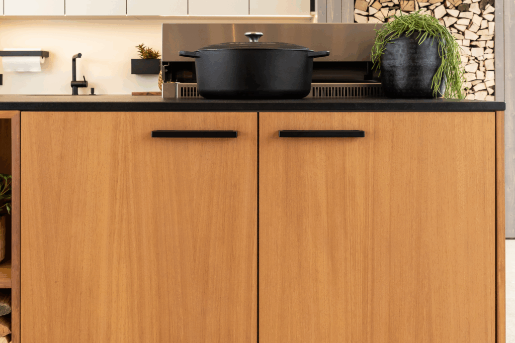 Geölte Iroko-Holzfronten bringen natürliche Wärme in Ihre Küche – individuell im Ausdruck, benötigen etwas Pflege oder können im Freien stilvoll verwittern.