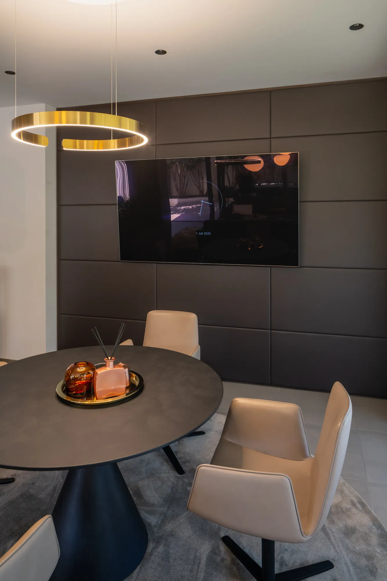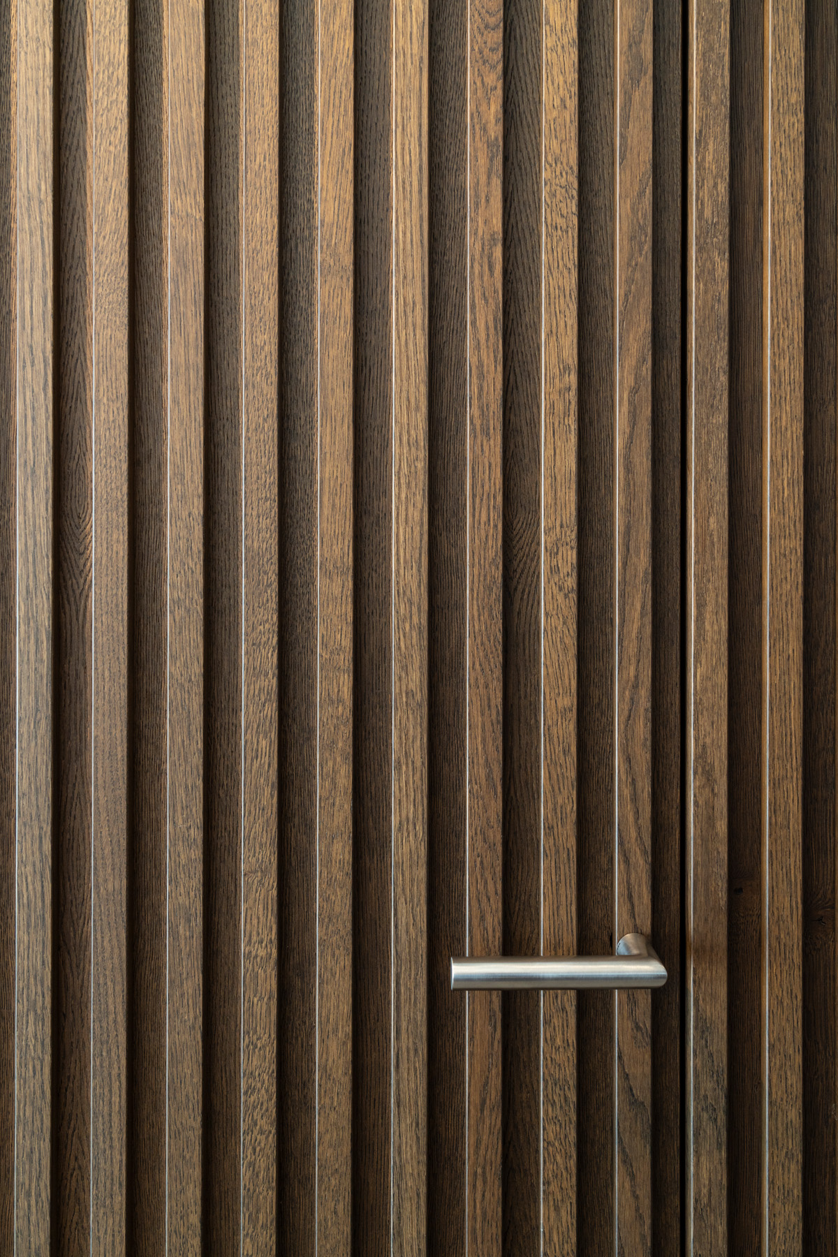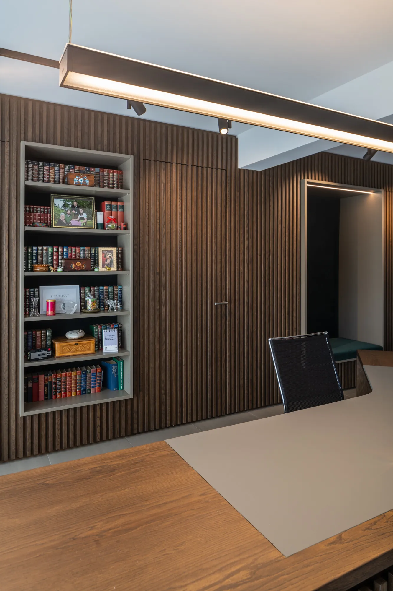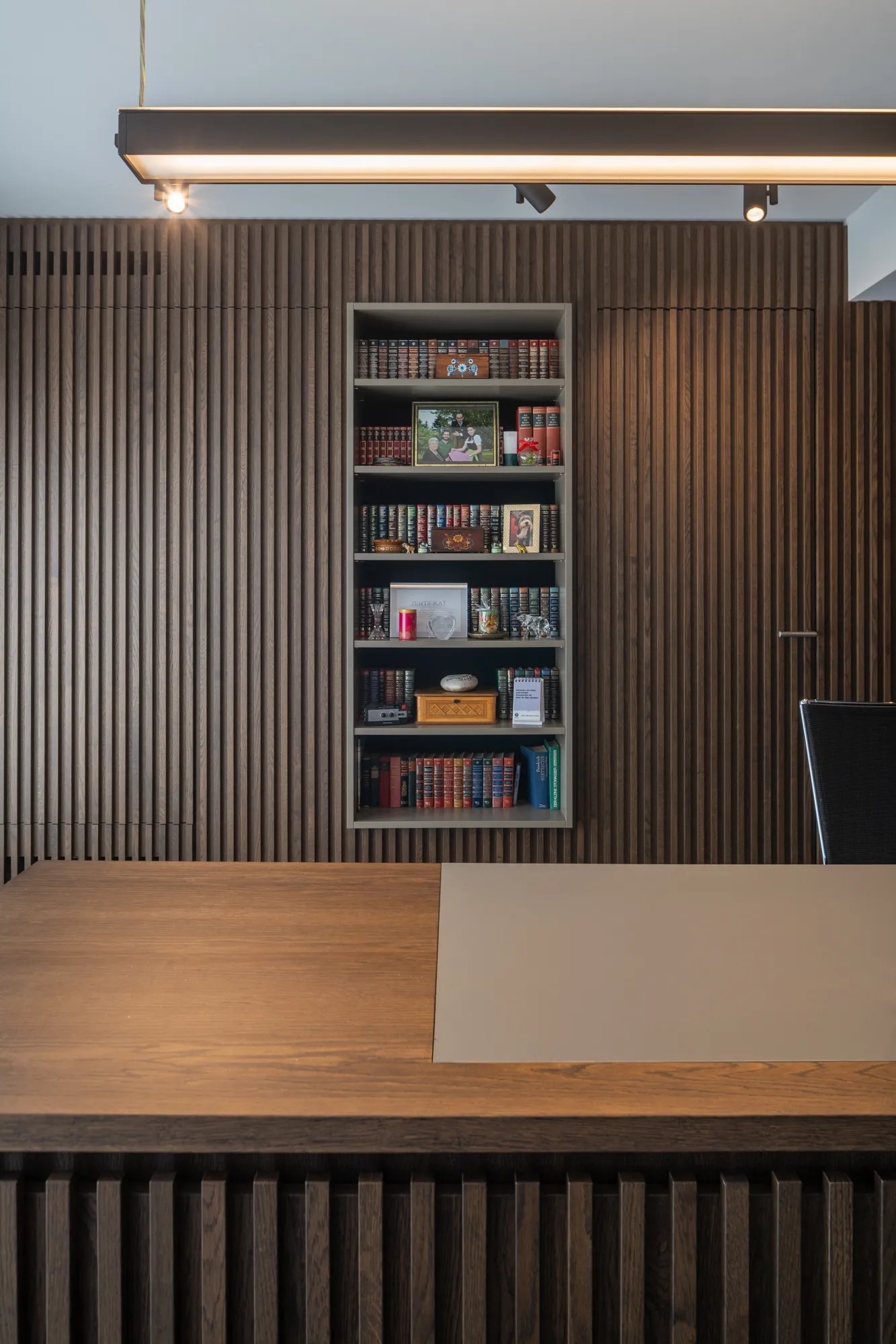 Dieses Büro zeigt, wie Handwerkskunst und Design zu einem stimmigen Ganzen verschmelzen. Dunkel gebeizte Eiche bildet die Basis, während Messing für edle Akzente sorgt. Die sorgfältig gestalteten Details verleihen den Räumen Charakter – ein Ort, der Eleganz, Konzentration und Wohlgefühl verbindet.