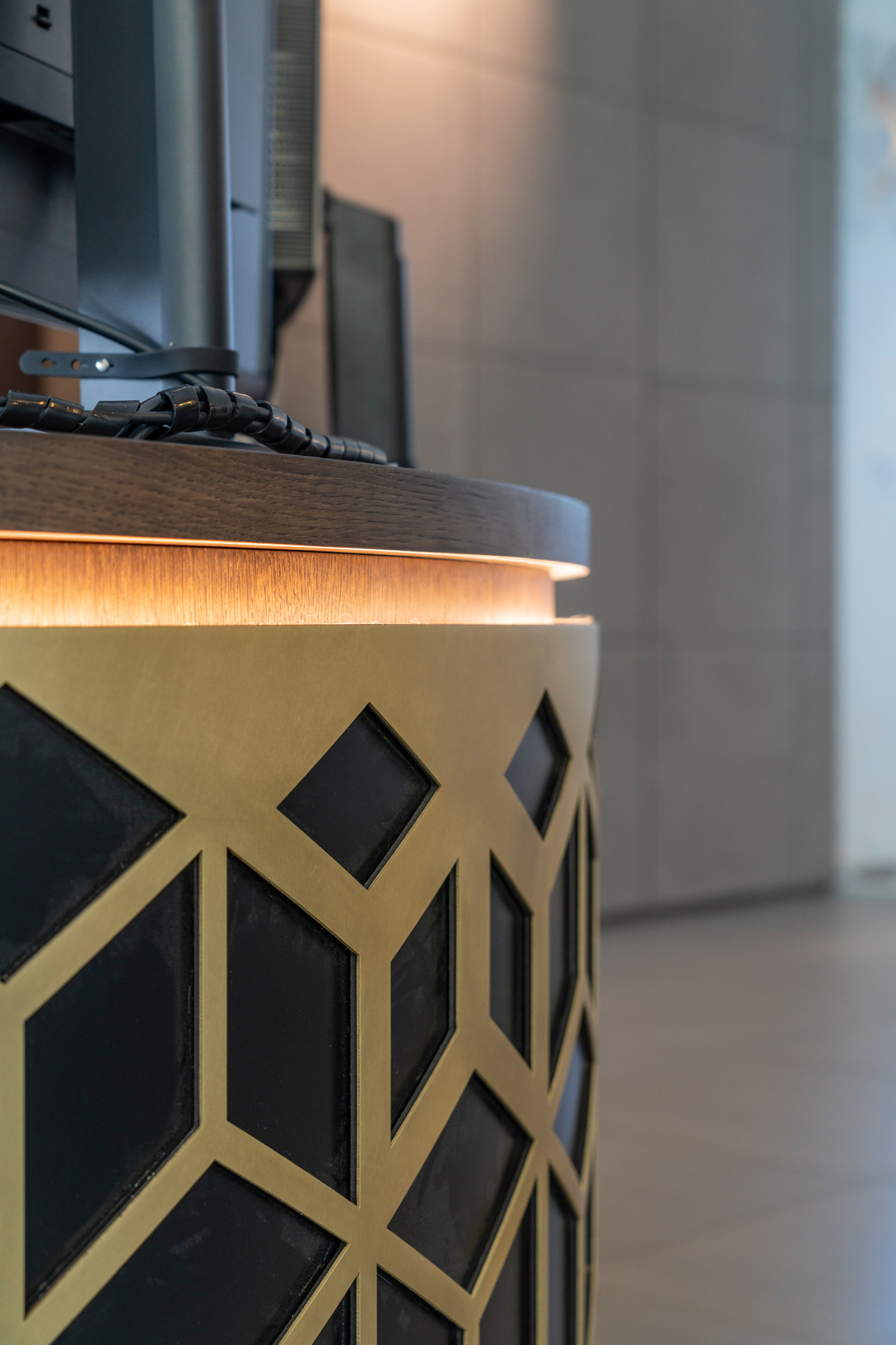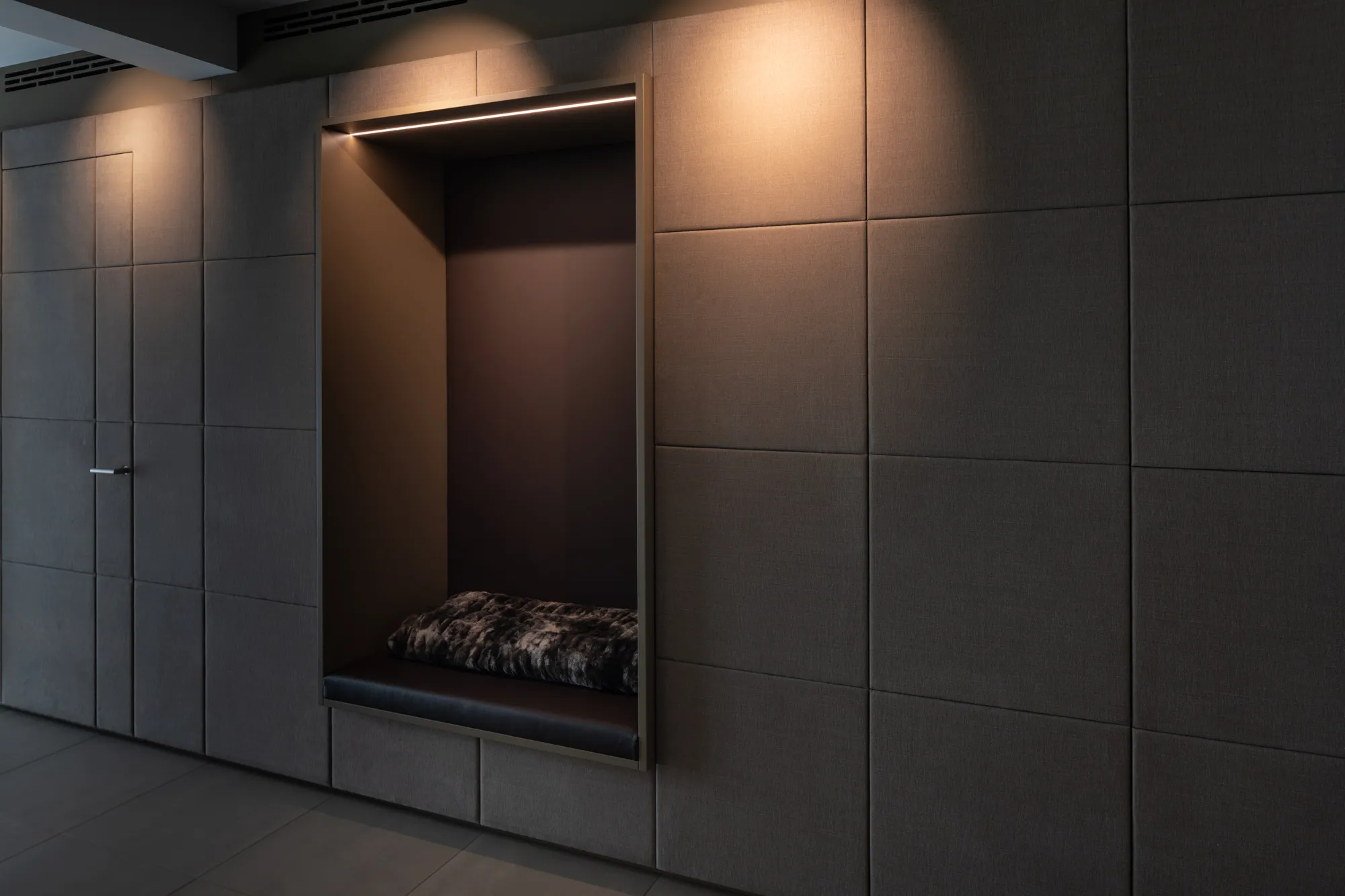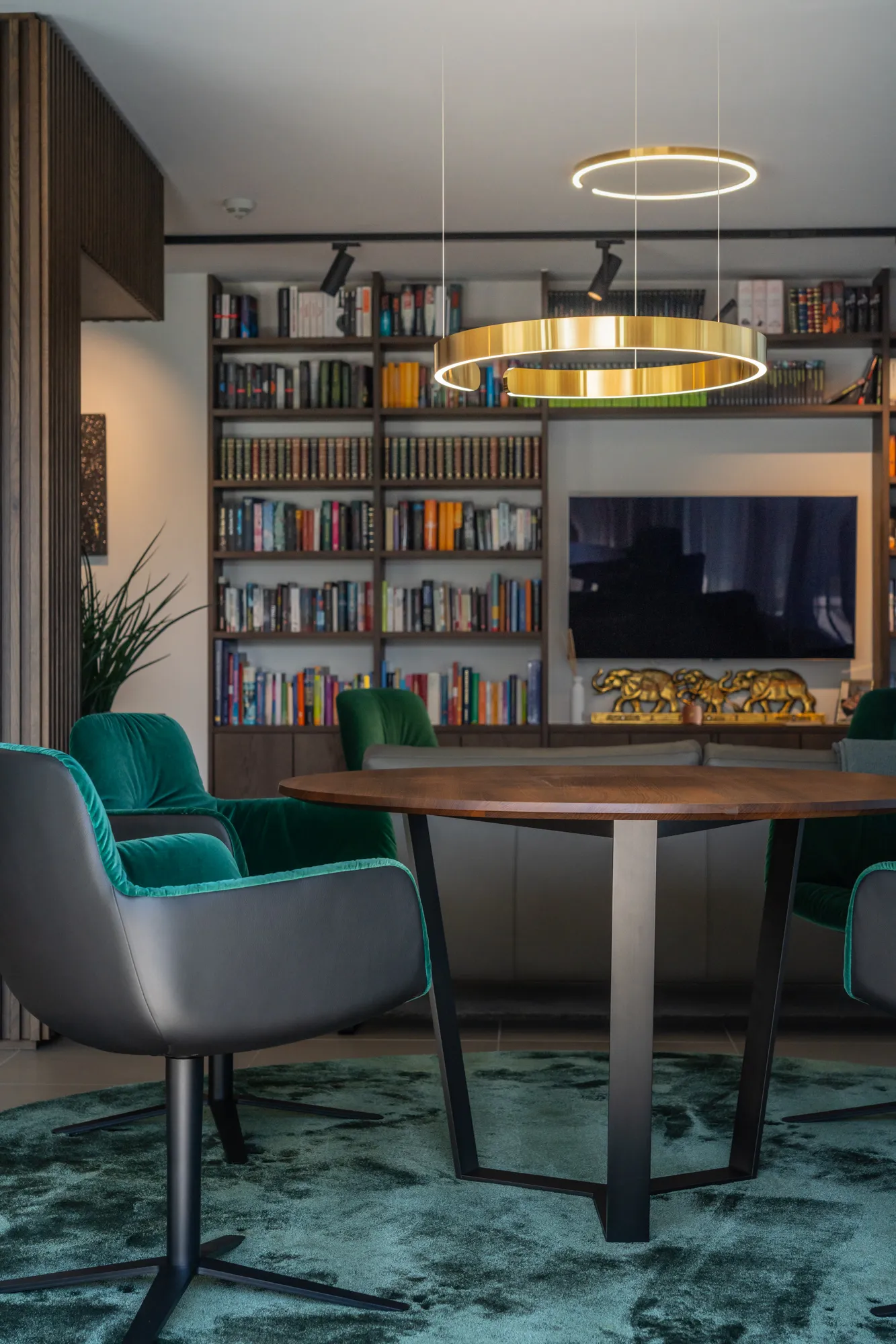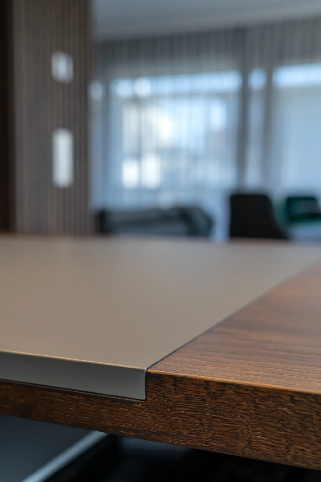 Dieses Büro zeigt, wie Handwerkskunst und Design zu einem stimmigen Ganzen verschmelzen. Dunkel gebeizte Eiche bildet die Basis, während Messing für edle Akzente sorgt. Die sorgfältig gestalteten Details verleihen den Räumen Charakter – ein Ort, der Eleganz, Konzentration und Wohlgefühl verbindet.