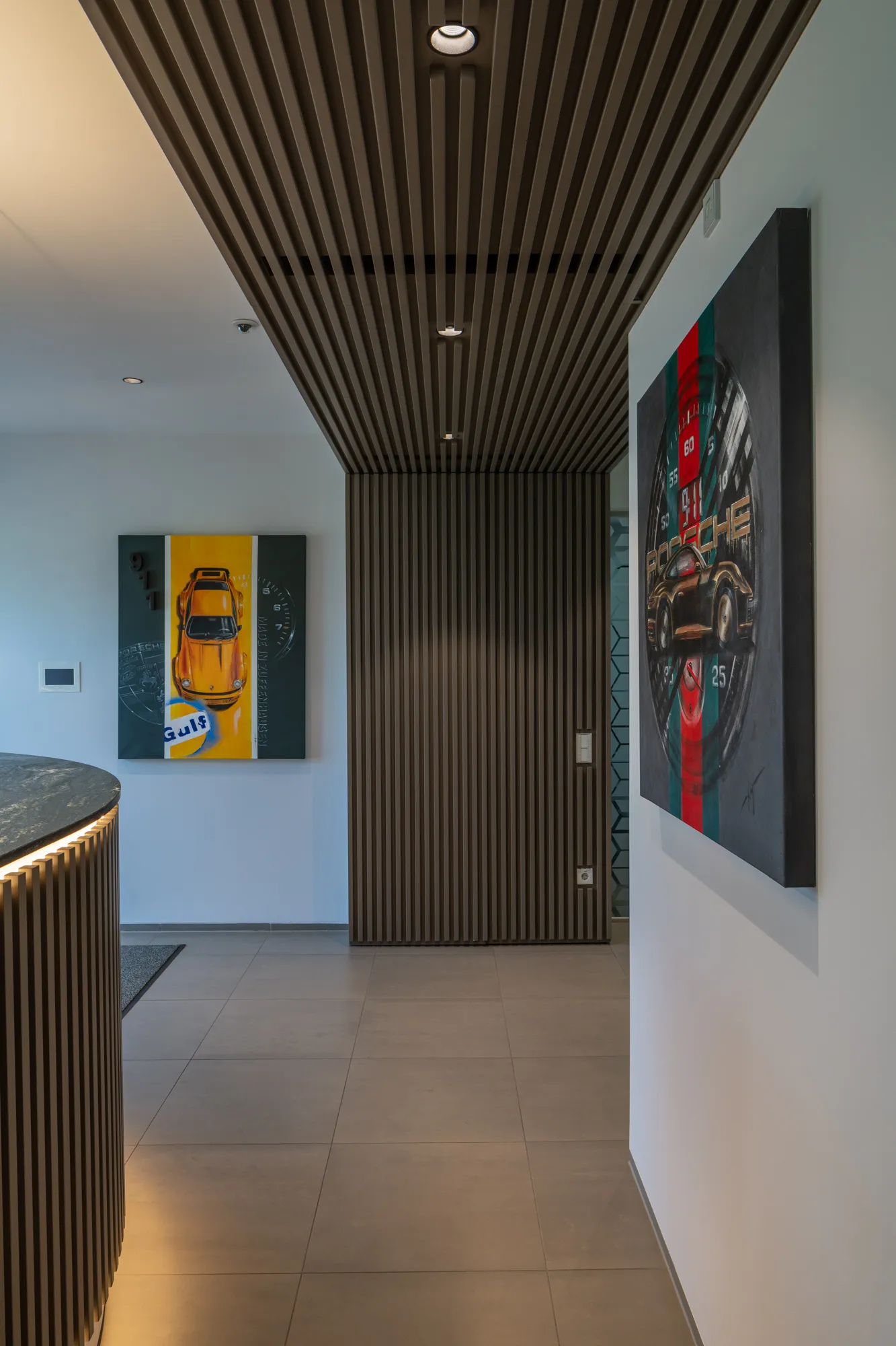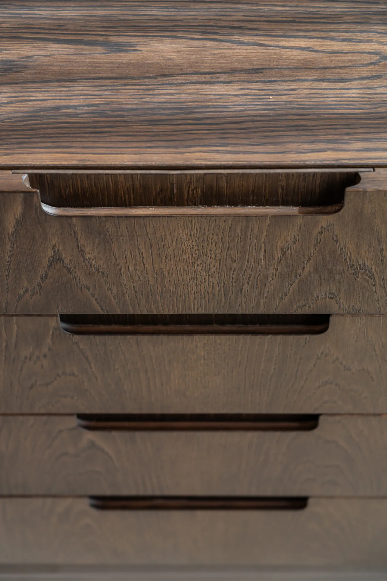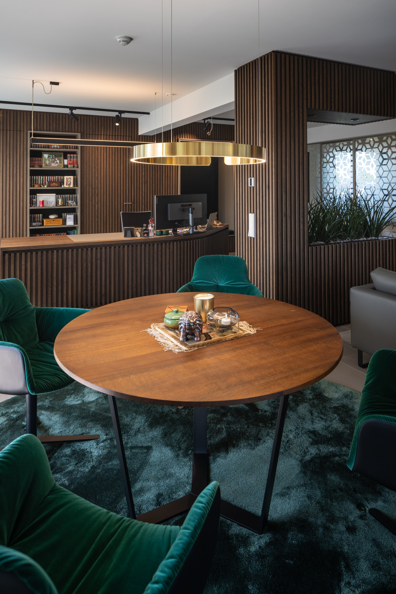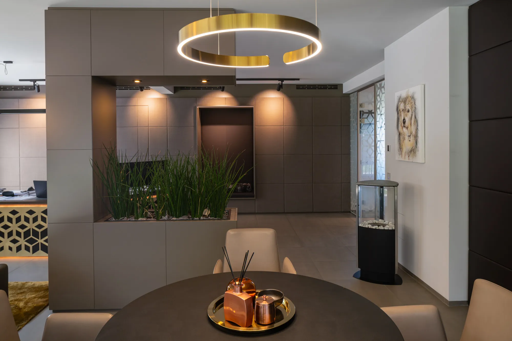 Dieses Büro zeigt, wie Handwerkskunst und Design zu einem stimmigen Ganzen verschmelzen. Dunkel gebeizte Eiche bildet die Basis, während Messing für edle Akzente sorgt. Die sorgfältig gestalteten Details verleihen den Räumen Charakter – ein Ort, der Eleganz, Konzentration und Wohlgefühl verbindet.