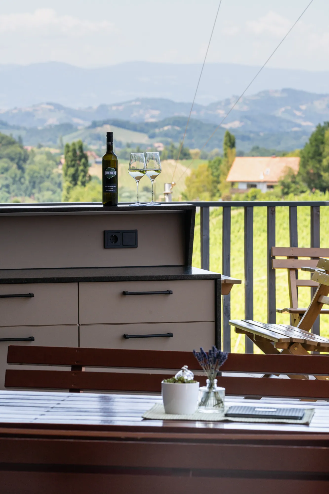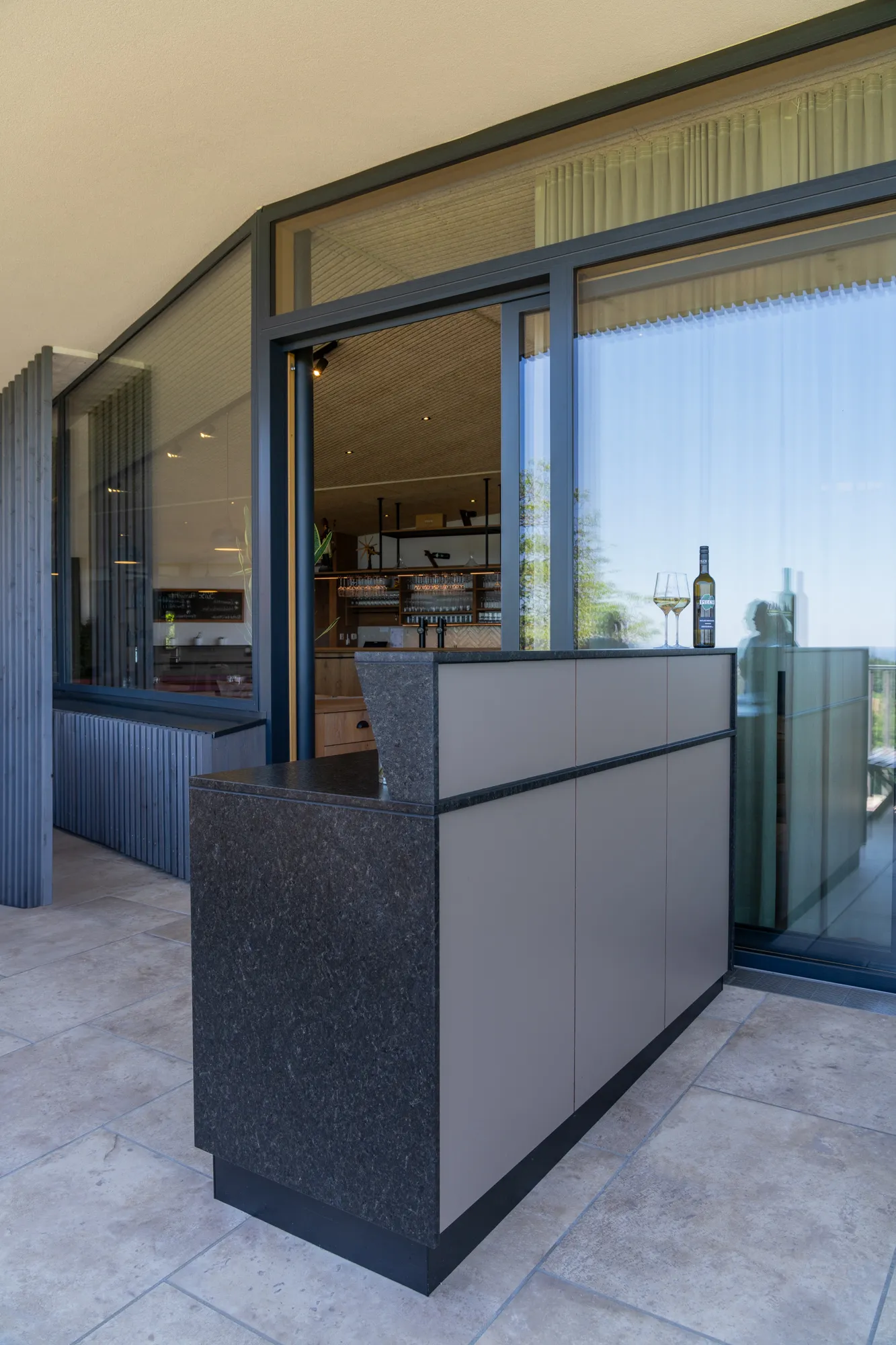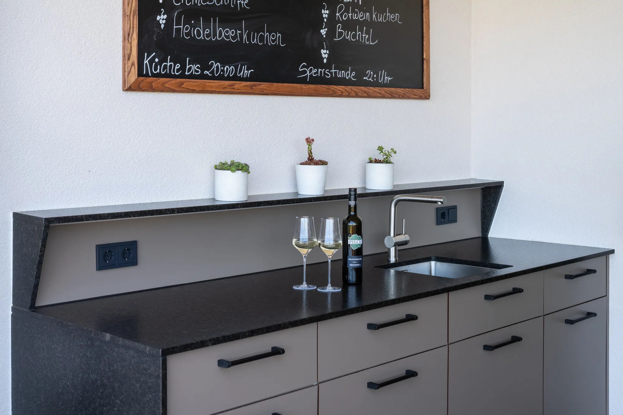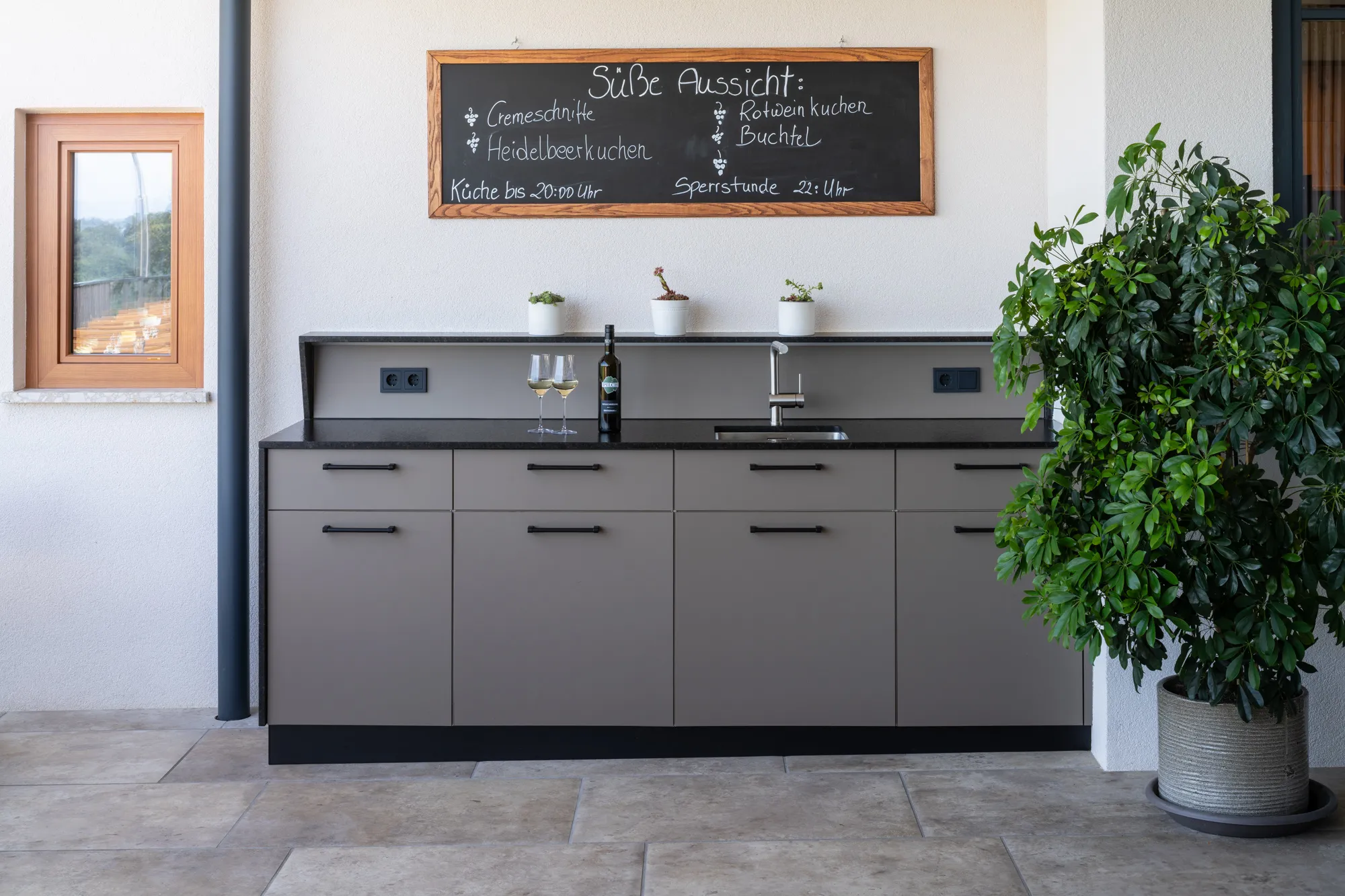 Unsere Outdoormöbel bringen Ordnung und Leichtigkeit ins Draußen. Alles hat seinen Platz – von Servietten bis Speisekarten, geschützt vor jedem Wetter und immer griffbereit. Gäste holen sich ihr Wasser selbst, frei und unkompliziert. Der Baraufsatz mit integriertem Licht verwandelt das Möbel in einen Treffpunkt, der Atmosphäre schafft und zum Verweilen einlädt.
