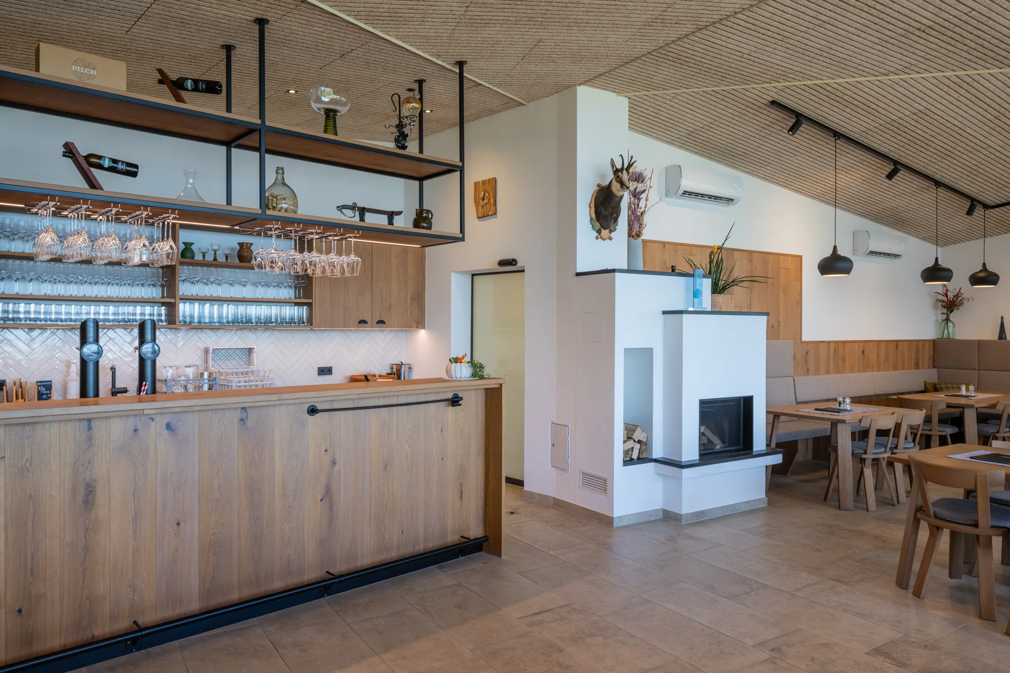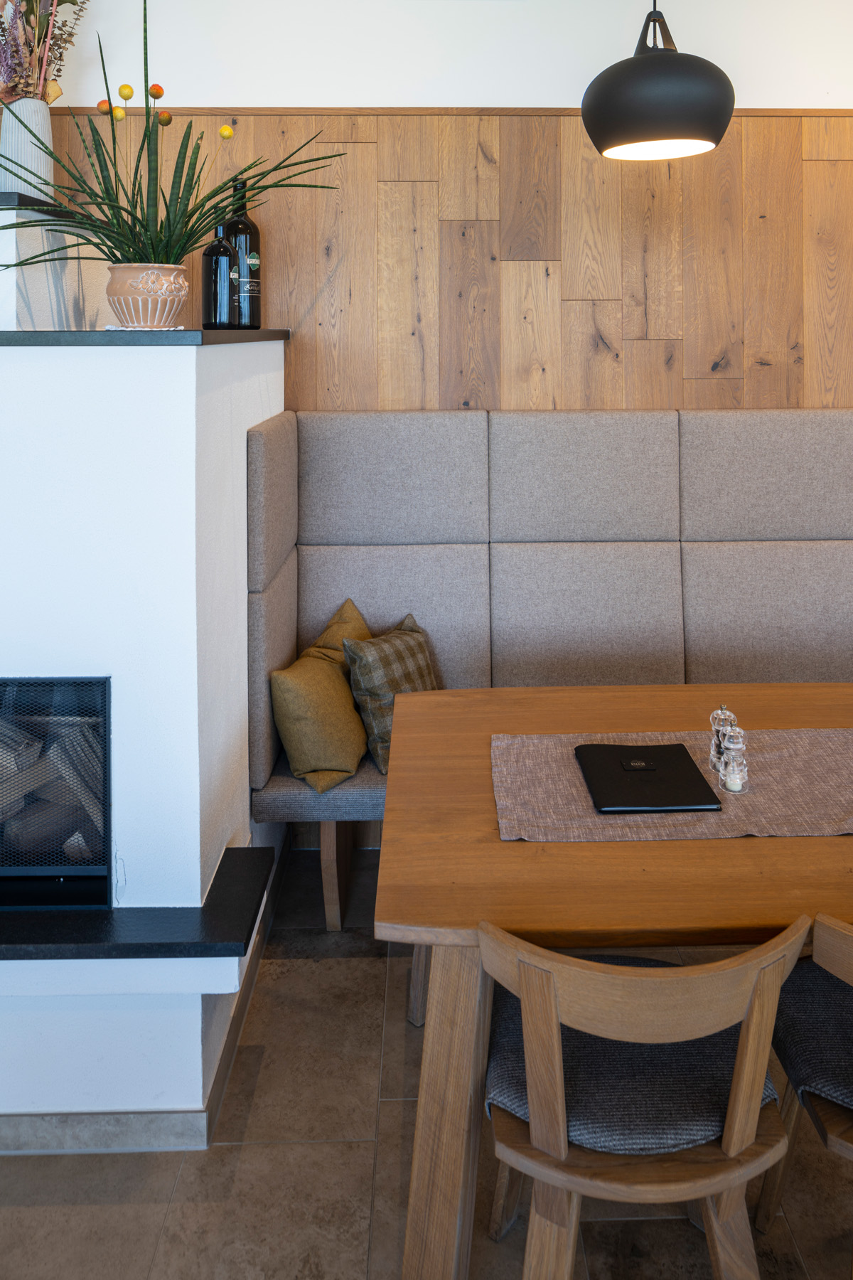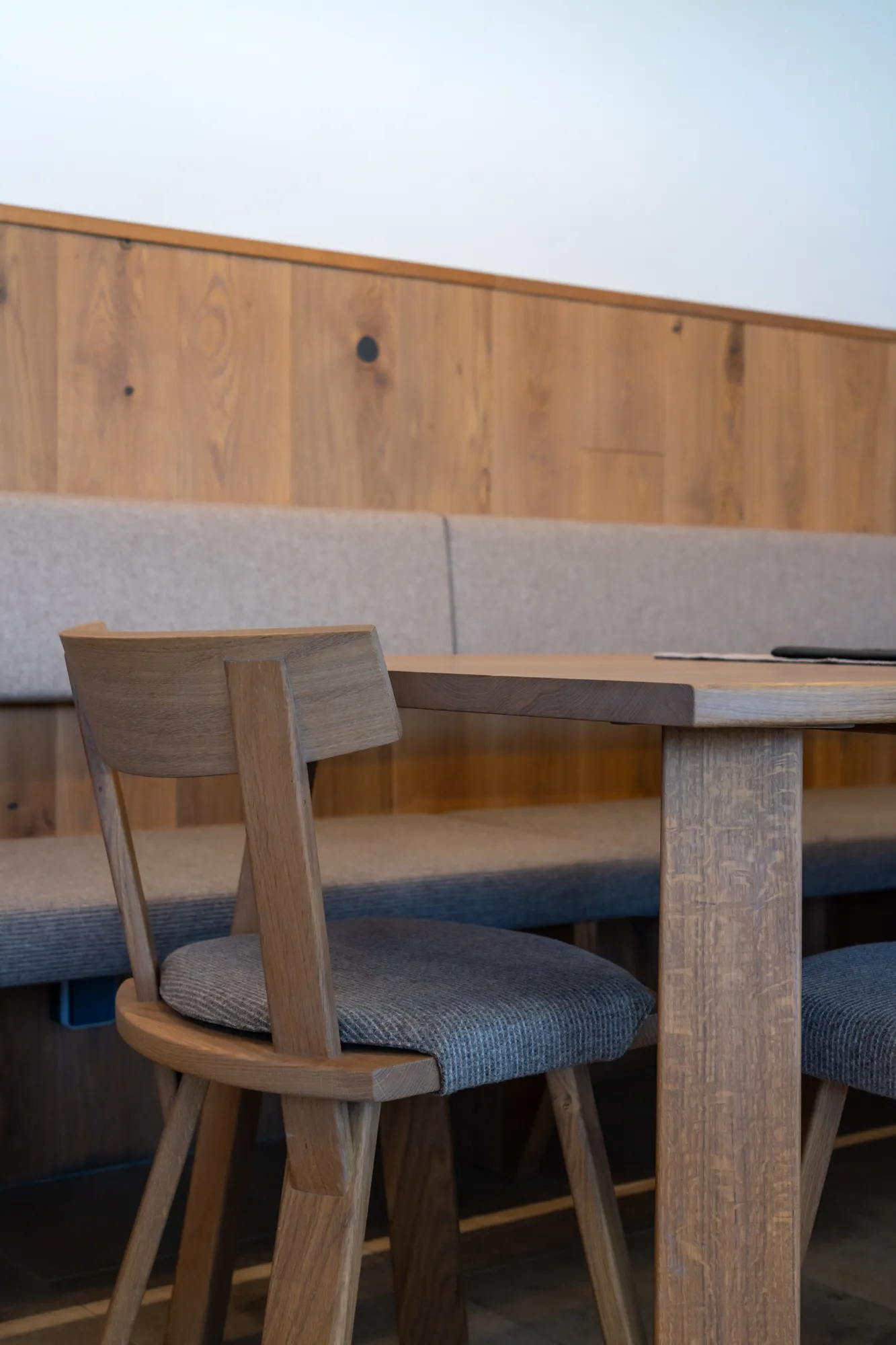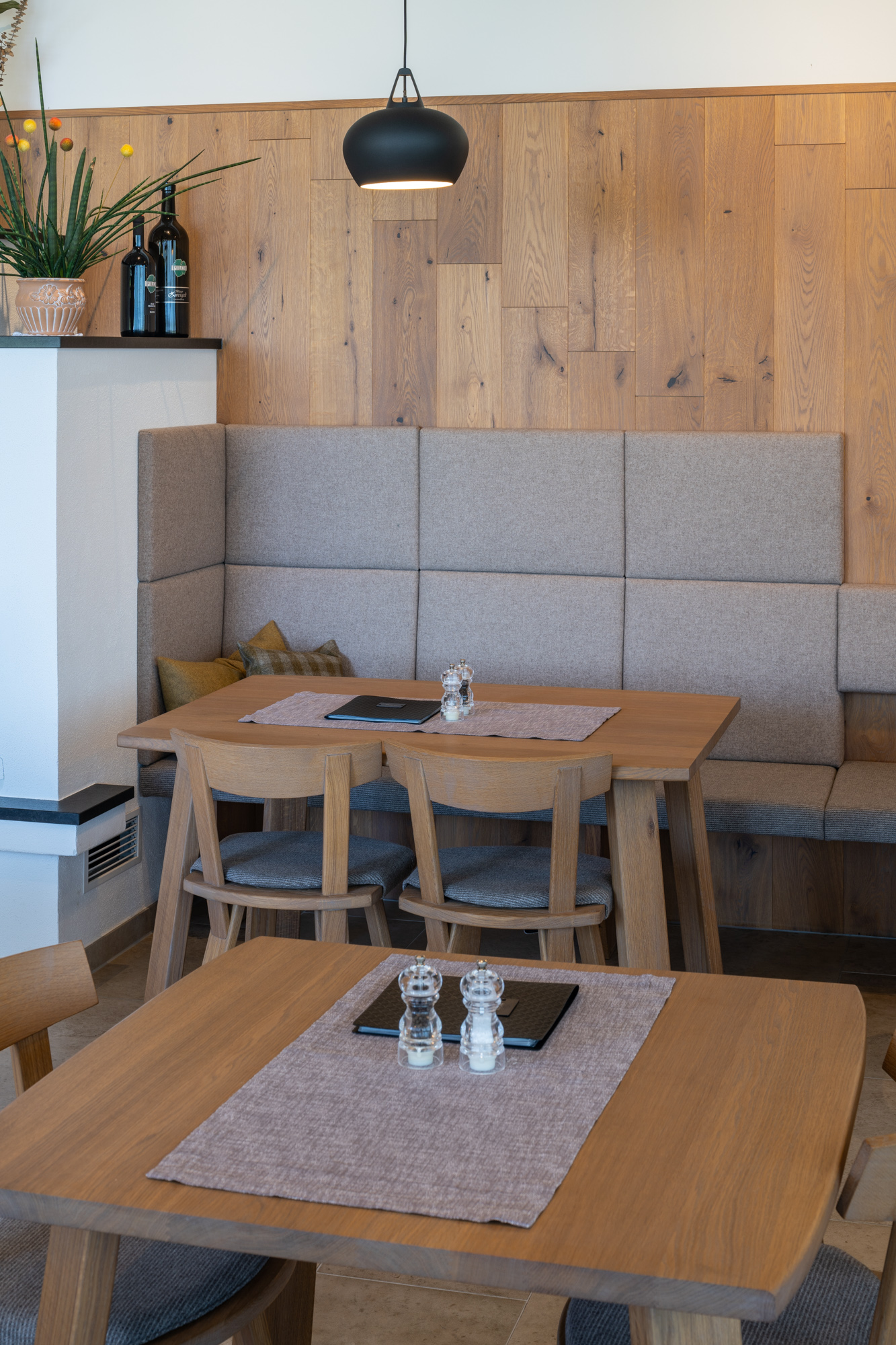 Natürliche Materialien und handwerkliche Details machen diesen Buschenschank zu einem Ort mit Seele. Braun geölte Eiche trifft auf Steiner Loden und geschmiedete Beschläge. Schwarzer Stahl verleiht klare Struktur, während die harmonische Materialkombination ein Ambiente schafft, das gemütlich, authentisch und einladend wirkt. Hier verbinden sich Genuss und Gemütlichkeit zu einer Atmosphäre, in der sich jeder willkommen fühlt.