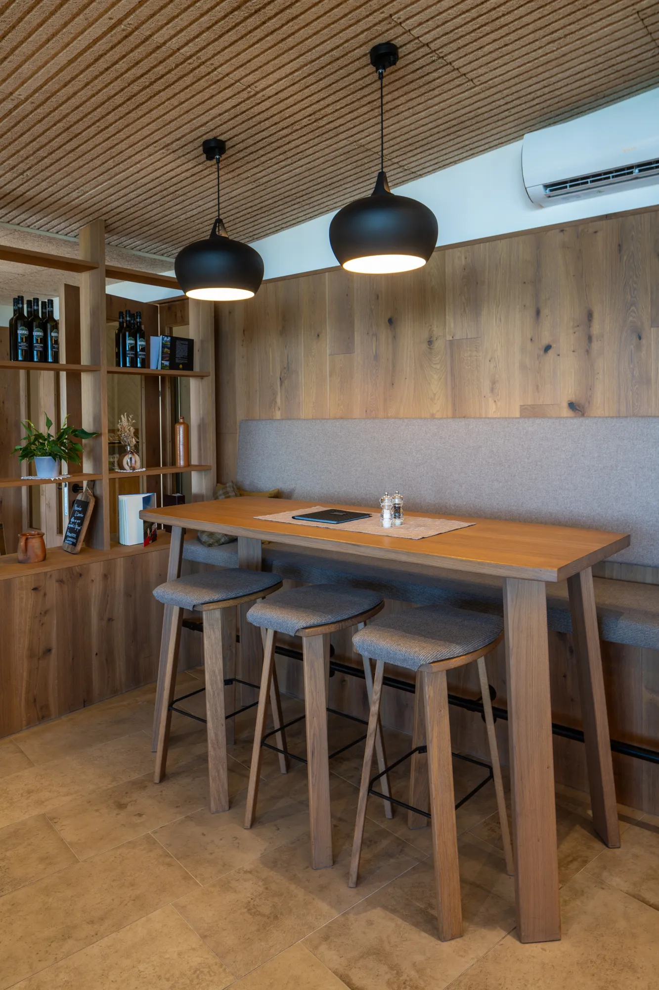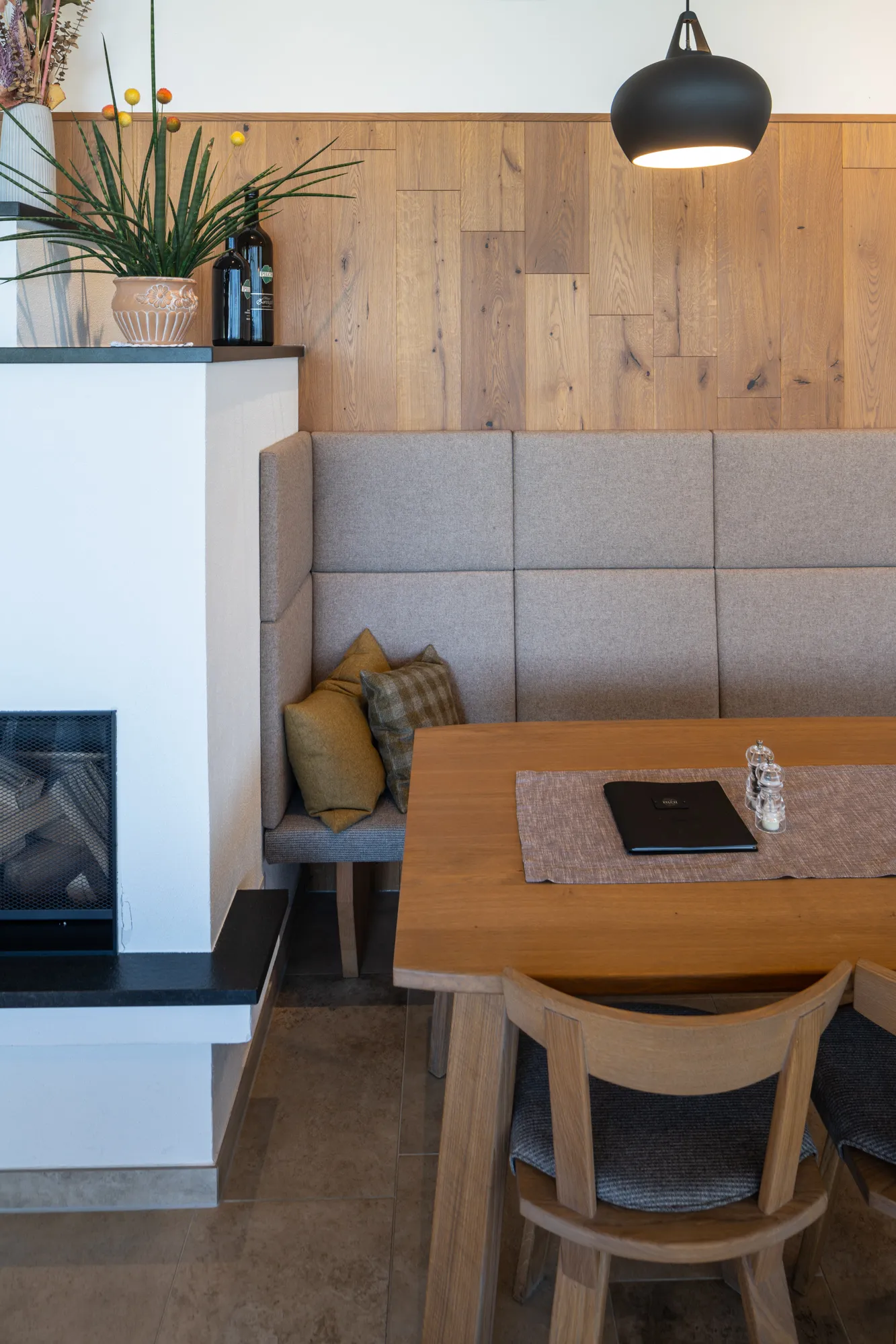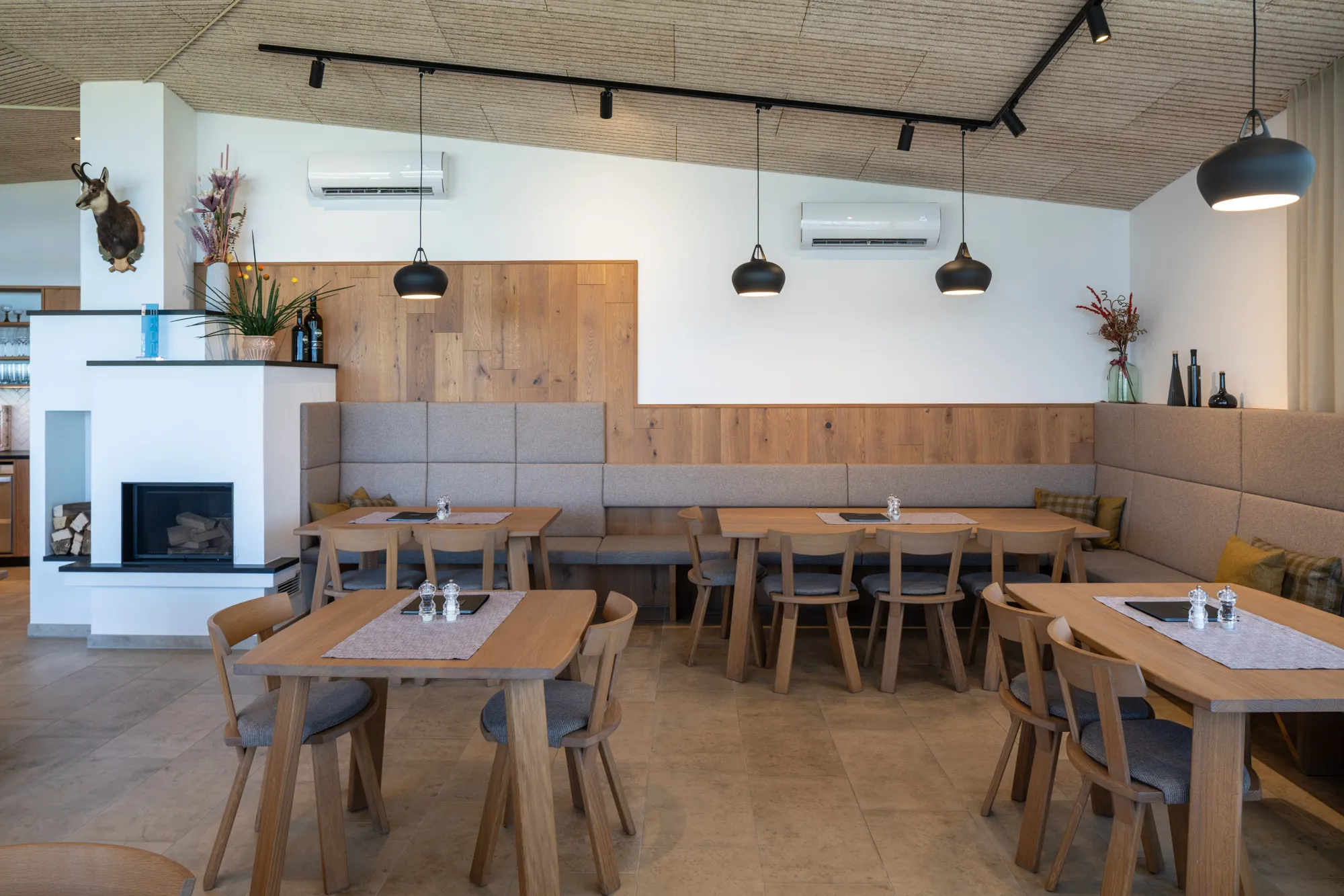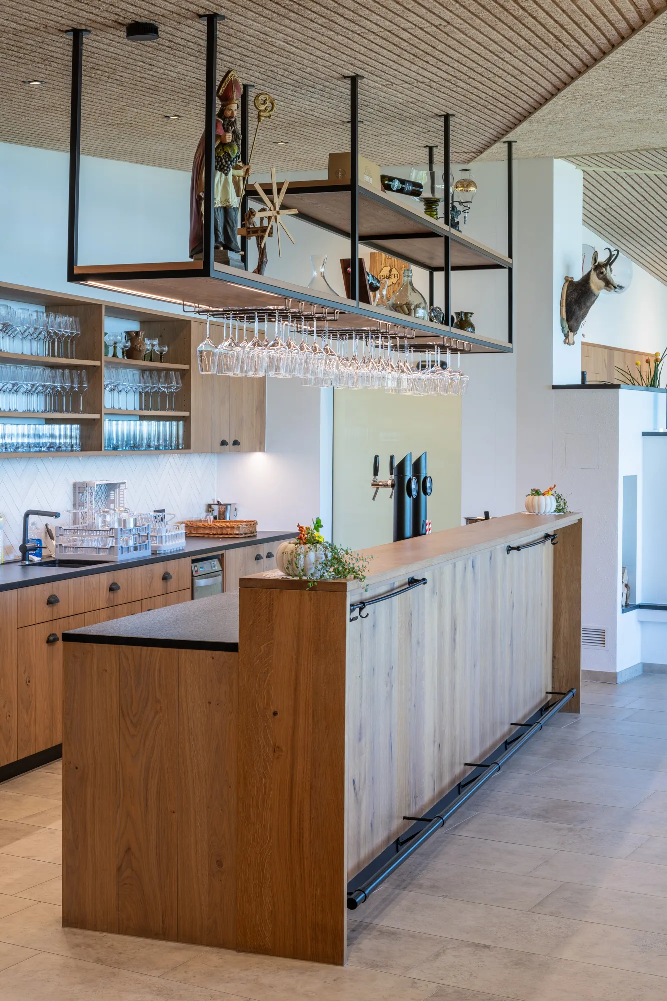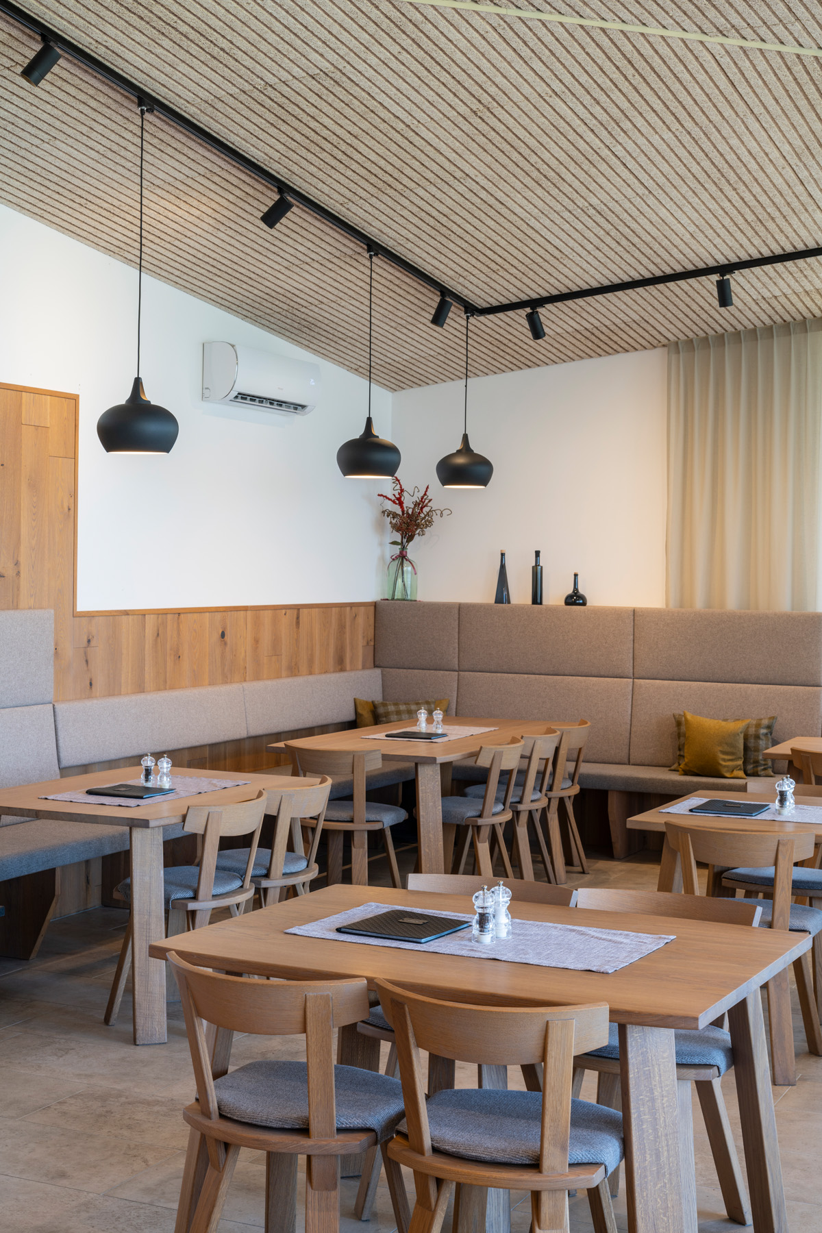 Natürliche Materialien und handwerkliche Details machen diesen Buschenschank zu einem Ort mit Seele. Braun geölte Eiche trifft auf Steiner Loden und geschmiedete Beschläge. Schwarzer Stahl verleiht klare Struktur, während die harmonische Materialkombination ein Ambiente schafft, das gemütlich, authentisch und einladend wirkt. Hier verbinden sich Genuss und Gemütlichkeit zu einer Atmosphäre, in der sich jeder willkommen fühlt.
