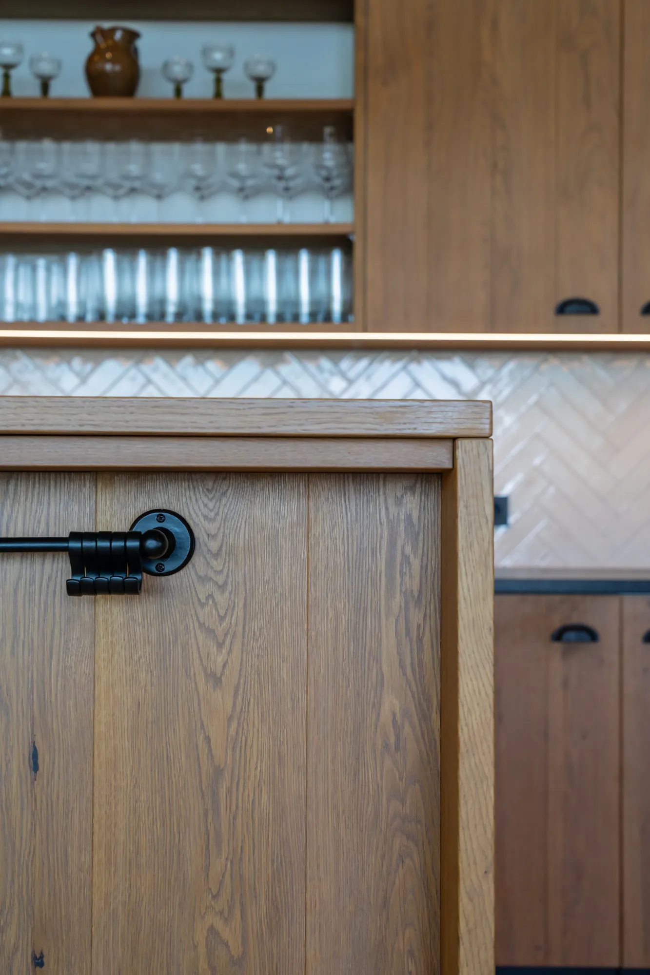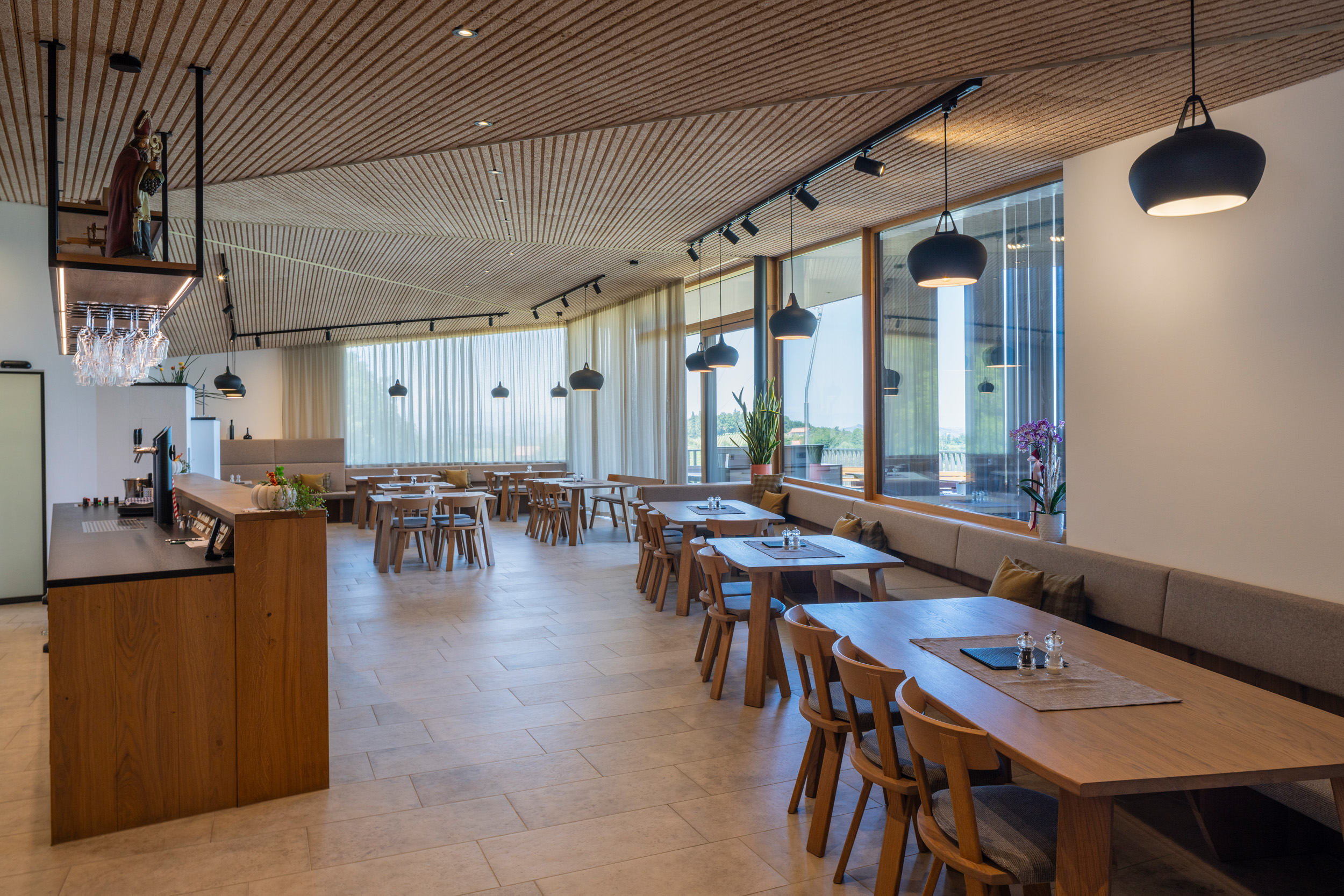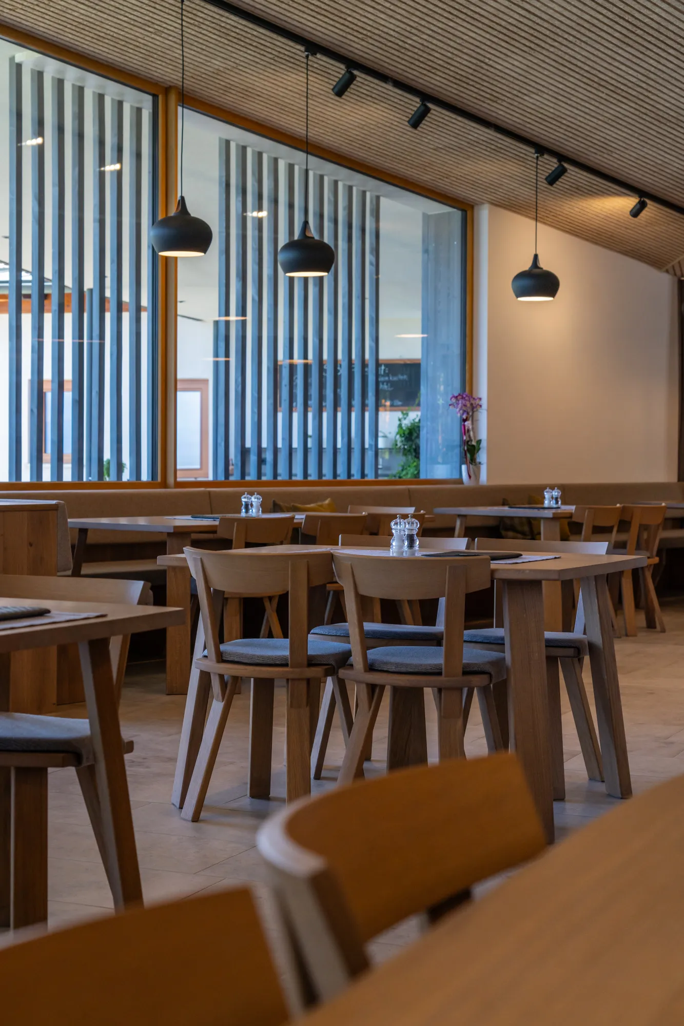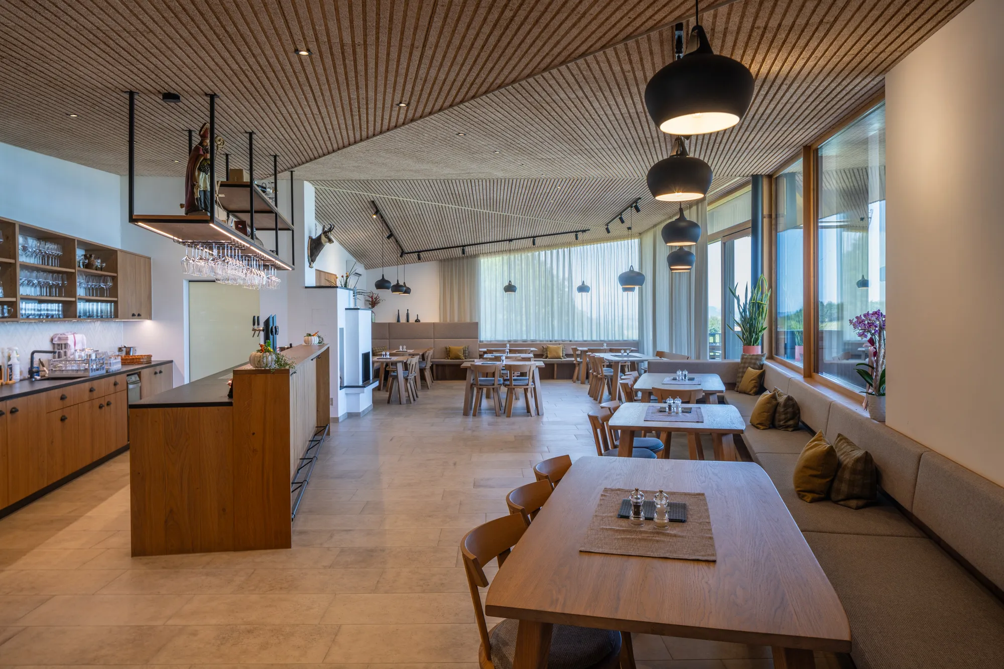 Natürliche Materialien und handwerkliche Details machen diesen Buschenschank zu einem Ort mit Seele. Braun geölte Eiche trifft auf Steiner Loden und geschmiedete Beschläge. Schwarzer Stahl verleiht klare Struktur, während die harmonische Materialkombination ein Ambiente schafft, das gemütlich, authentisch und einladend wirkt. Hier verbinden sich Genuss und Gemütlichkeit zu einer Atmosphäre, in der sich jeder willkommen fühlt.
