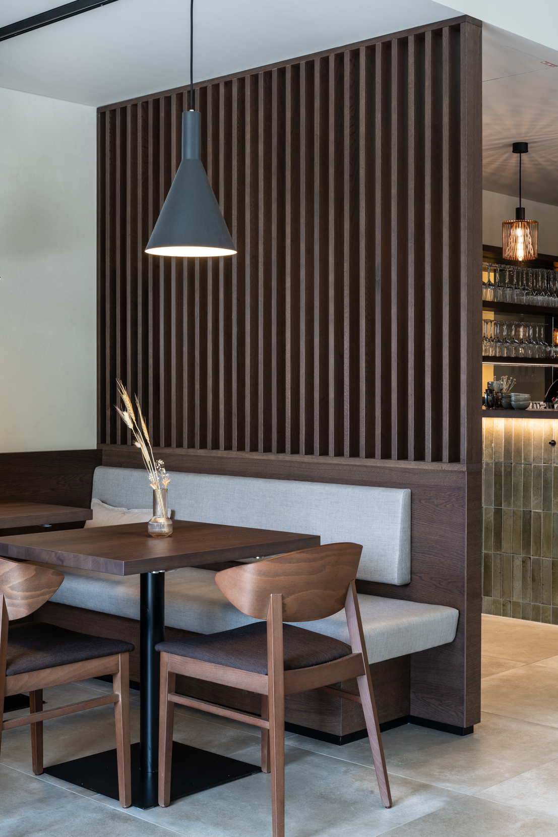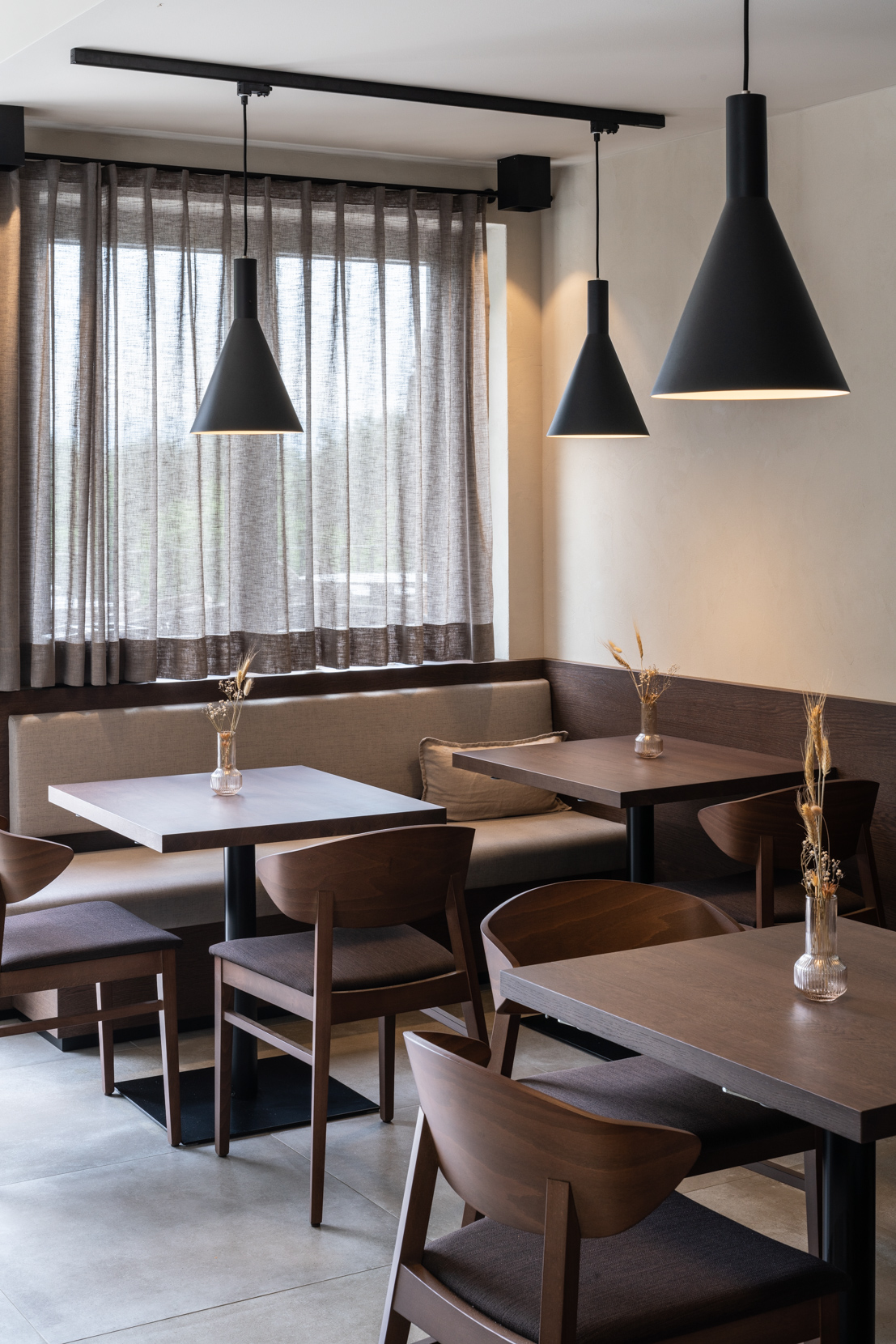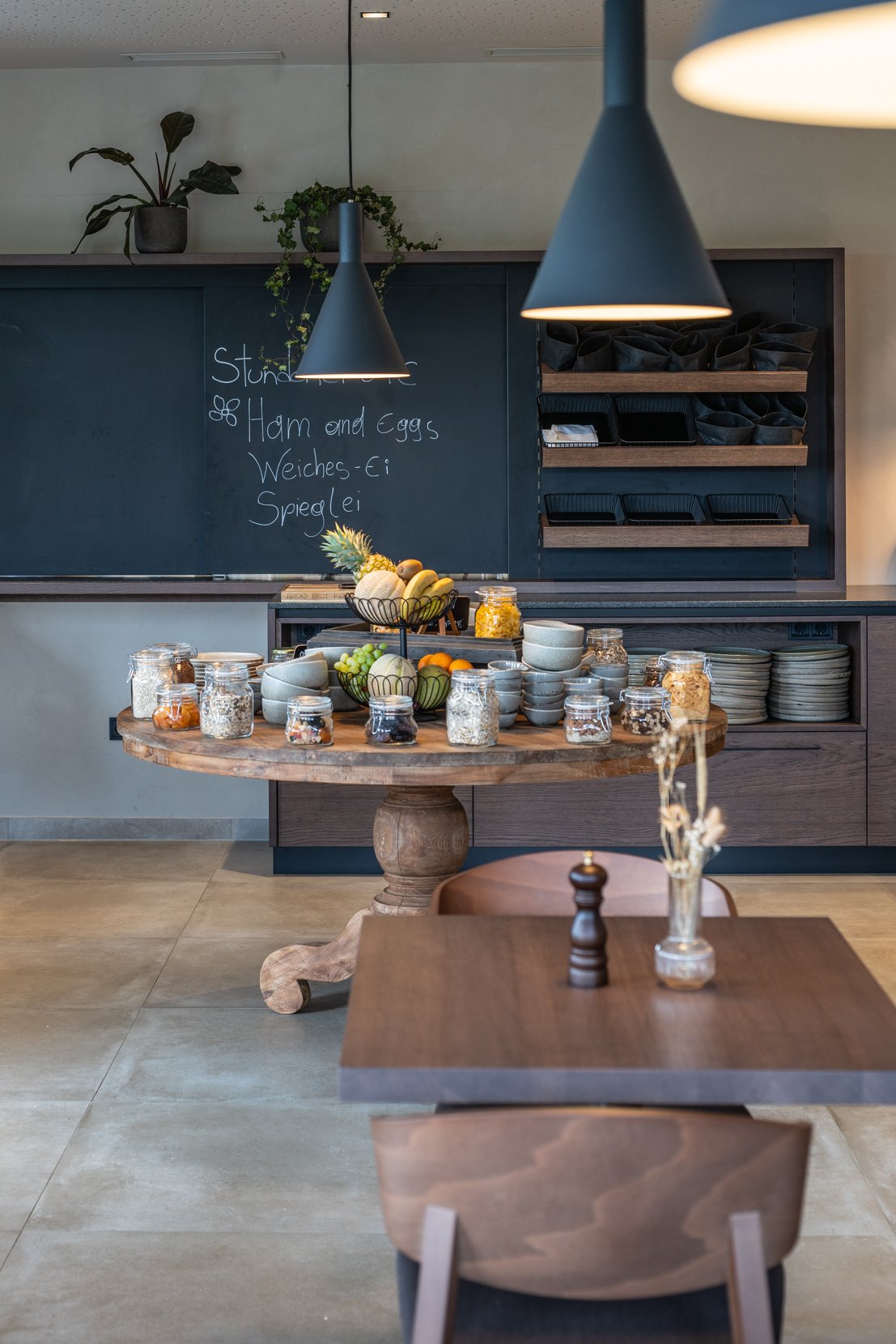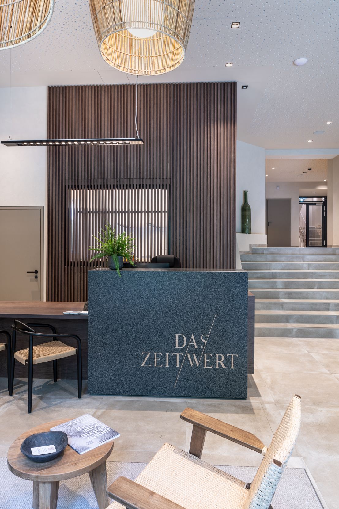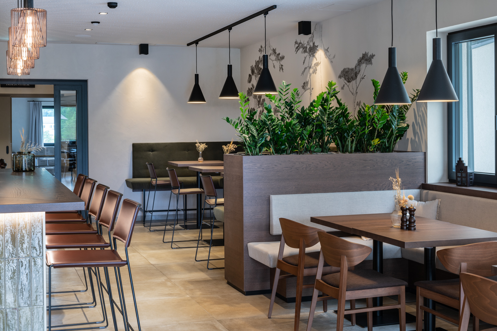 Naturstein Nero Impala und gebeizte, lackierte Eiche prägen das Interieur. Die klare Formsprache verbindet Eleganz mit Beständigkeit. Warme Materialien und sorgfältige Details schaffen Räume, die Ruhe ausstrahlen und zugleich modern wirken. Ein Hotel, das Geborgenheit und Stil vereint – für Gäste, die sich willkommen und wertgeschätzt fühlen.