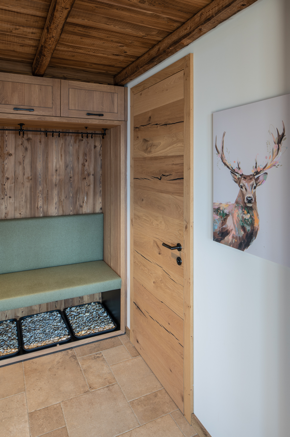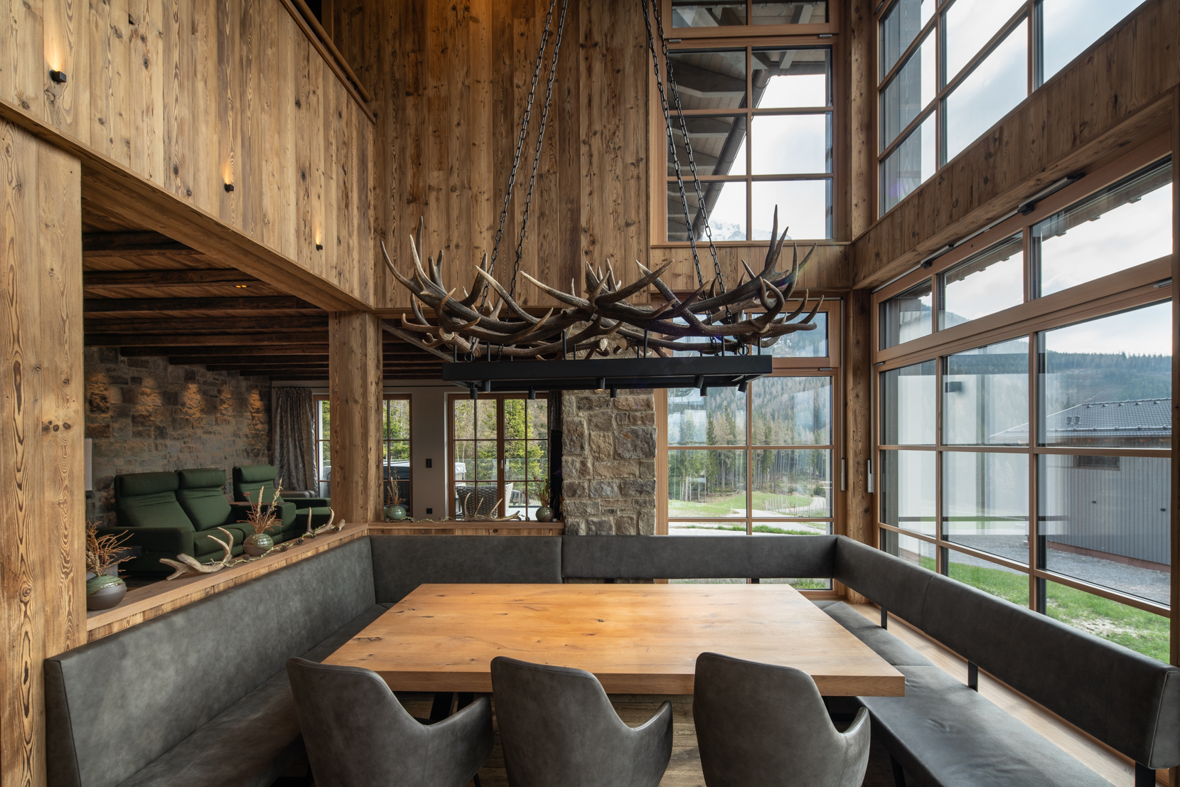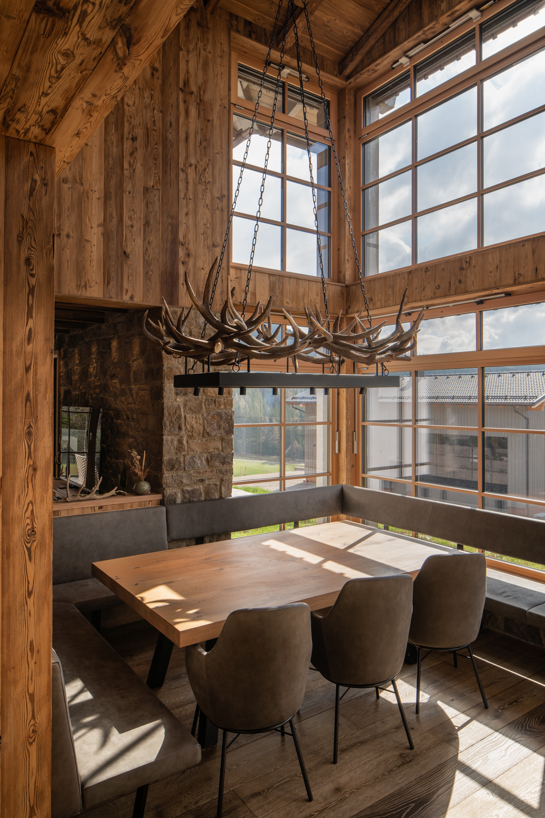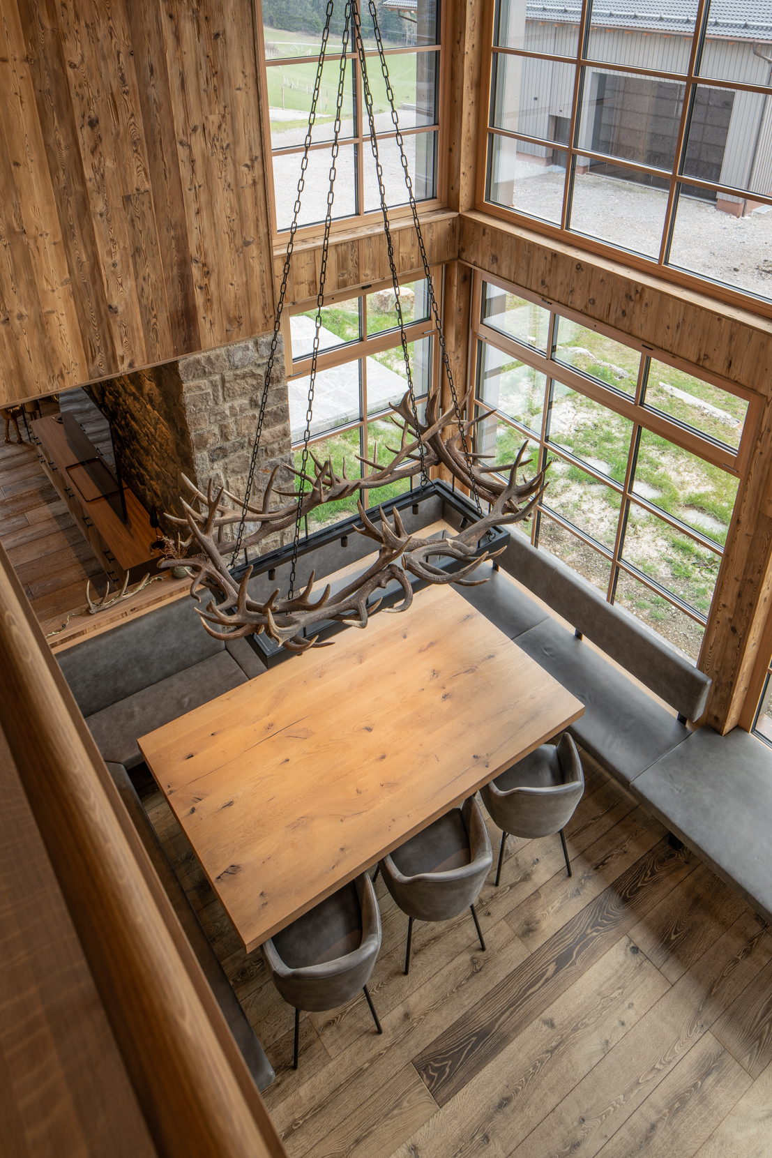Wandverkleidungen aus gedämpfter Fichte geben dem Jagdhaus seine warme, ursprüngliche Ausstrahlung. Möbel aus geöltem Eiche-Vollholz und geschmiedete Beschläge verstärken den urigen Charakter. Naturleder ergänzt die Räume mit weicher Haptik. Ein Rückzugsort, der Geborgenheit schenkt und die Nähe zur Natur spürbar macht.