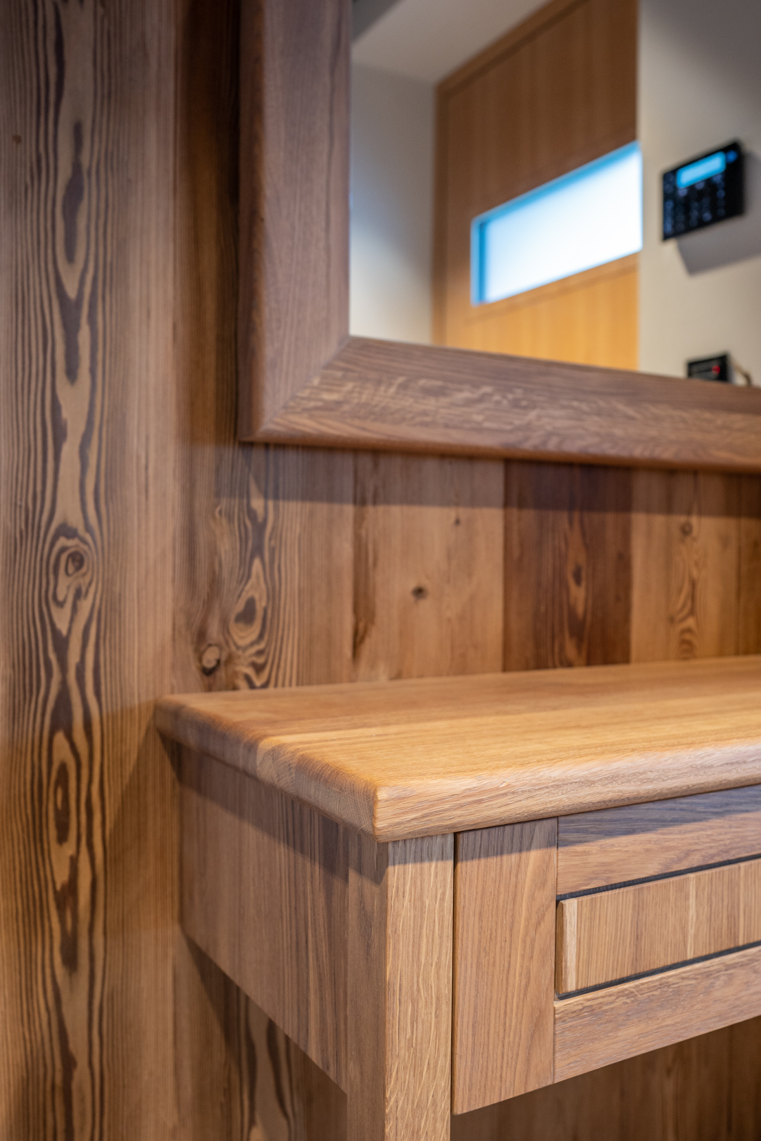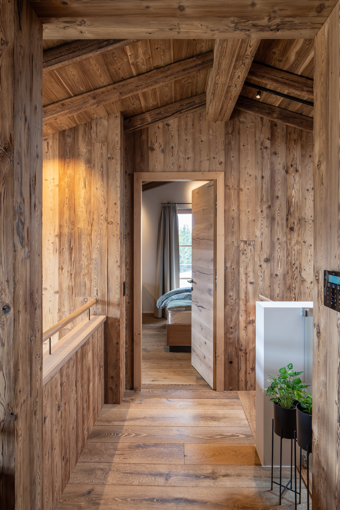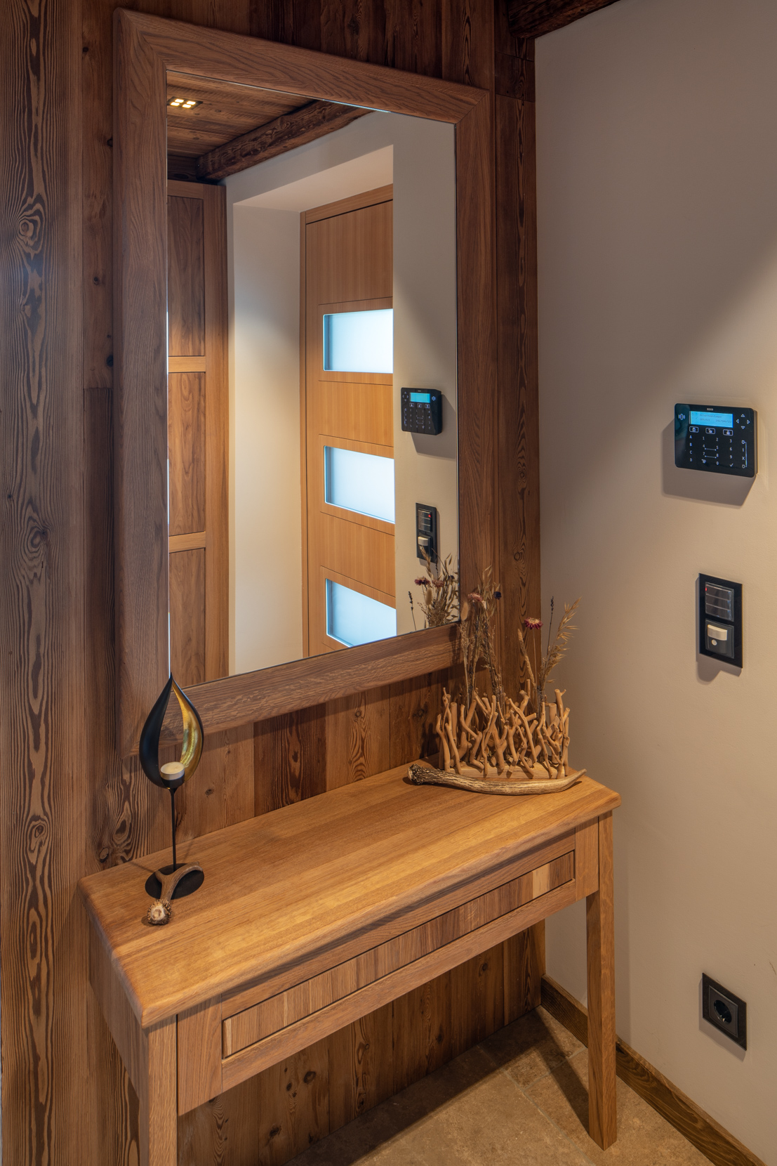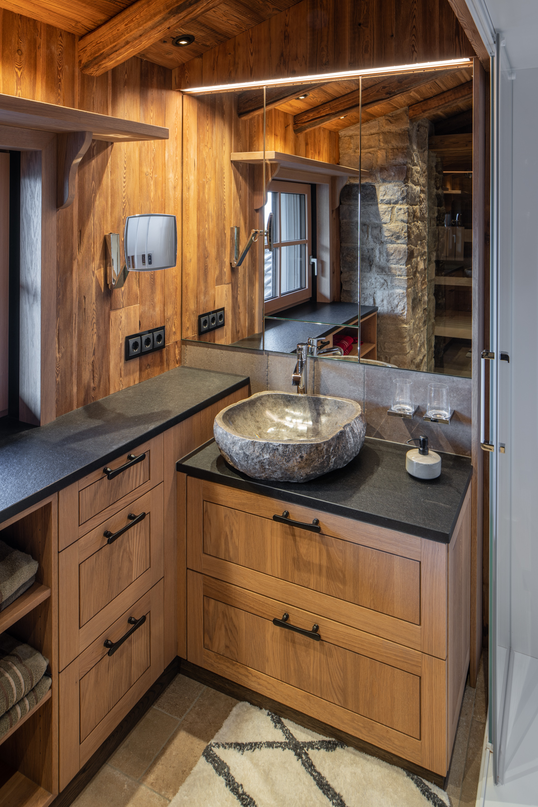 Wandverkleidungen aus gedämpfter Fichte geben dem Jagdhaus seine warme, ursprüngliche Ausstrahlung. Möbel aus geöltem Eiche-Vollholz und geschmiedete Beschläge verstärken den urigen Charakter. Naturleder ergänzt die Räume mit weicher Haptik. Ein Rückzugsort, der Geborgenheit schenkt und die Nähe zur Natur spürbar macht.