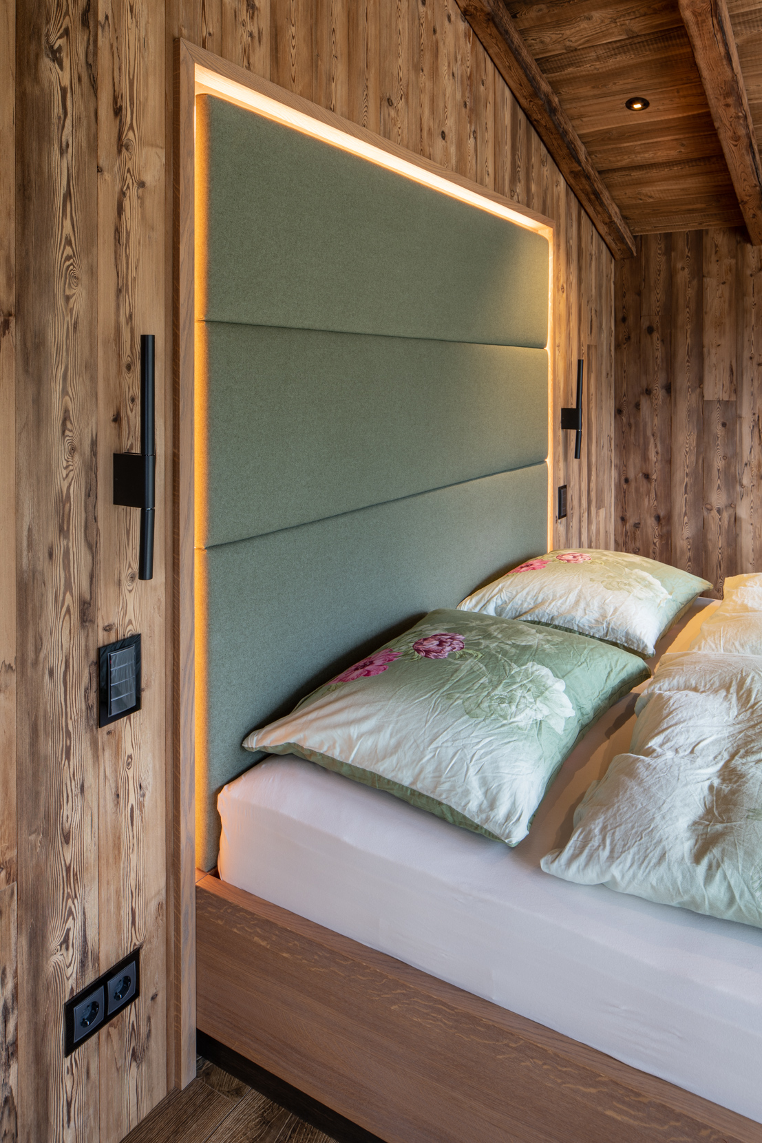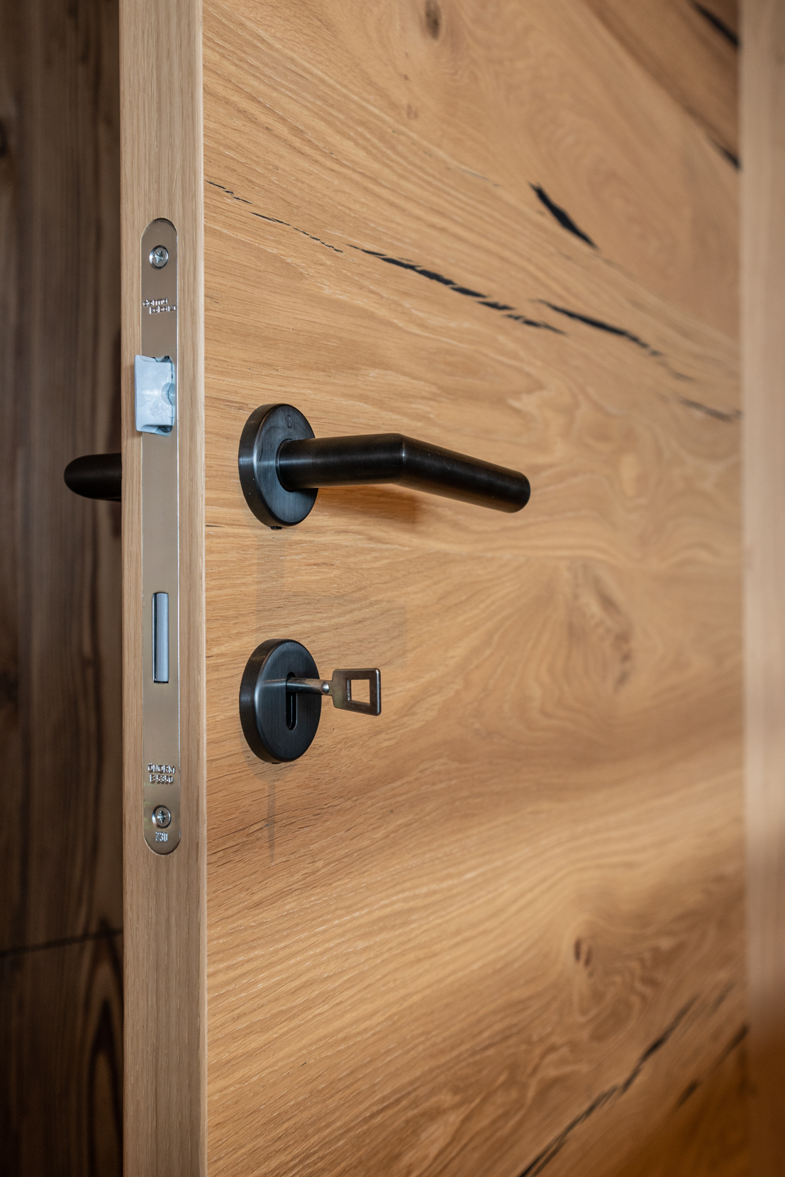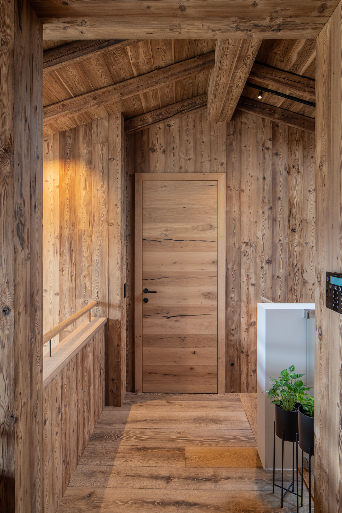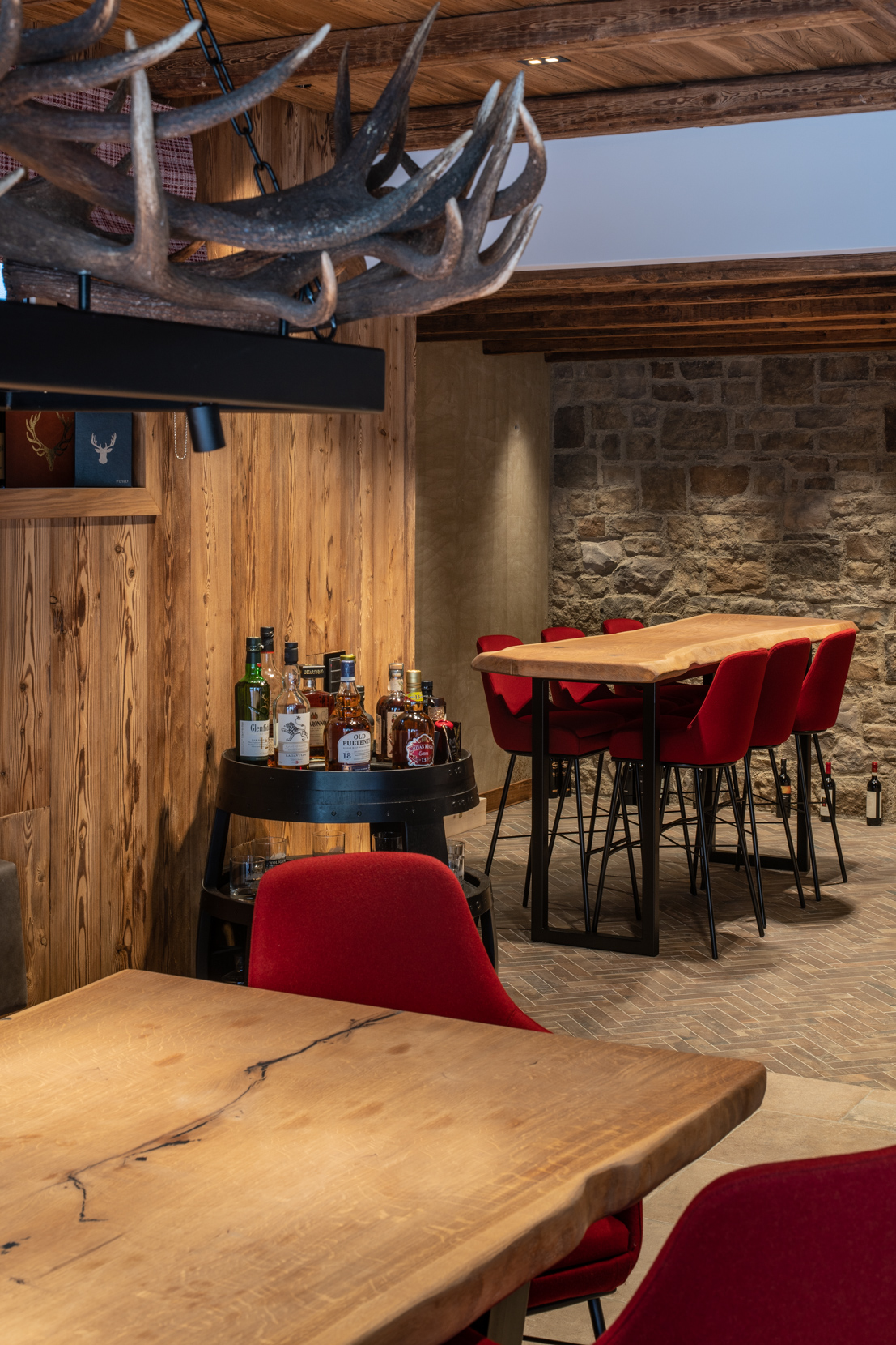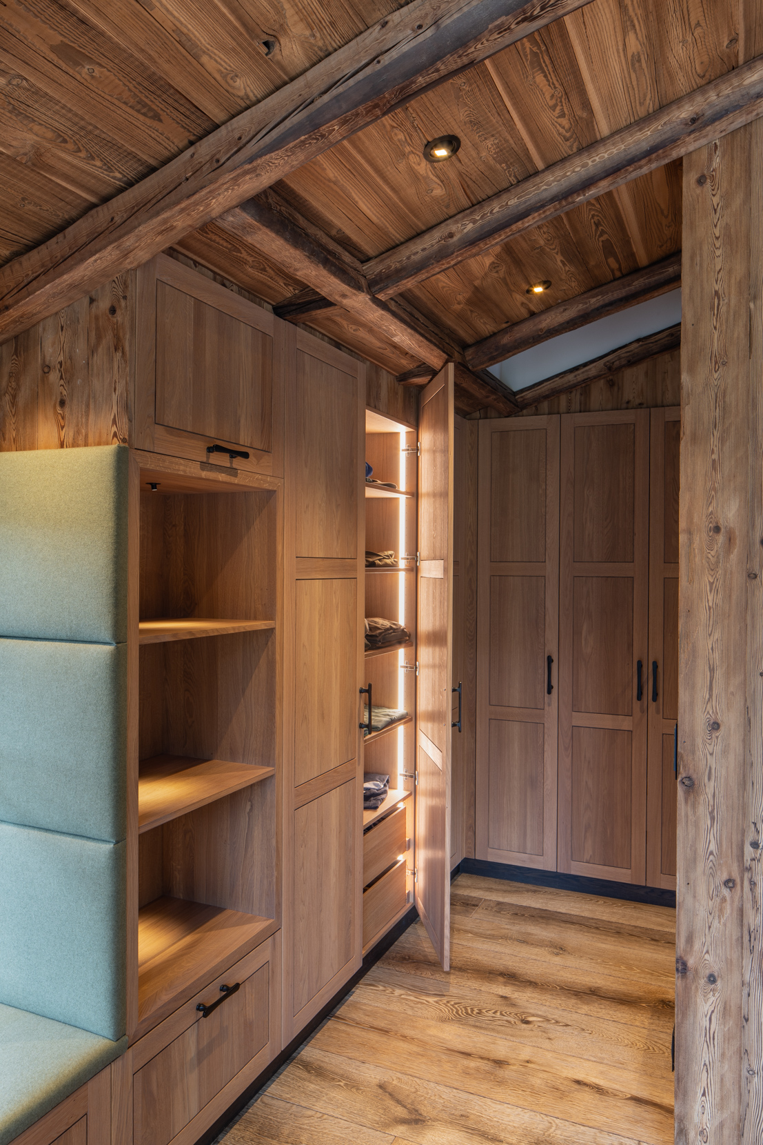 Wandverkleidungen aus gedämpfter Fichte geben dem Jagdhaus seine warme, ursprüngliche Ausstrahlung. Möbel aus geöltem Eiche-Vollholz und geschmiedete Beschläge verstärken den urigen Charakter. Naturleder ergänzt die Räume mit weicher Haptik. Ein Rückzugsort, der Geborgenheit schenkt und die Nähe zur Natur spürbar macht.