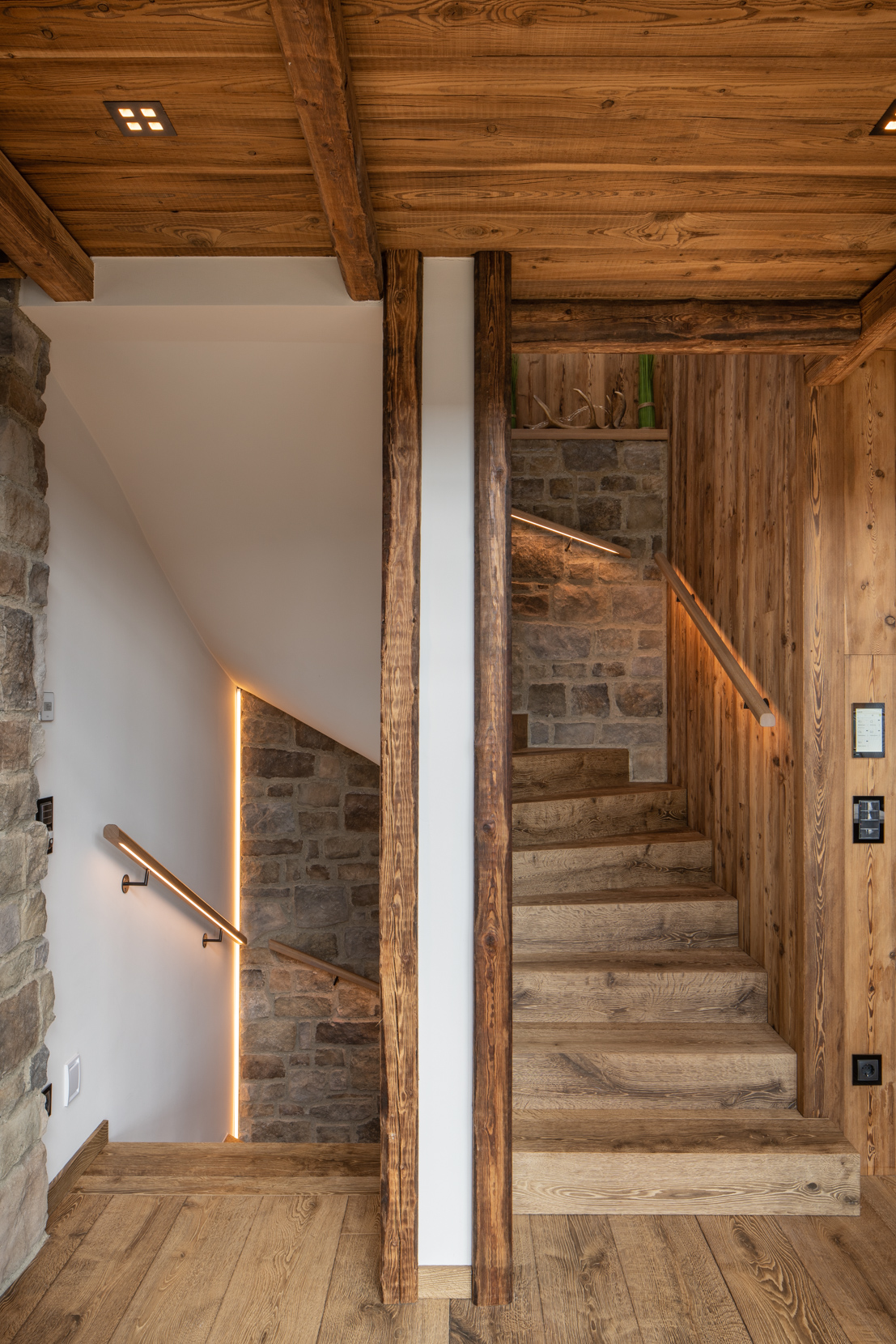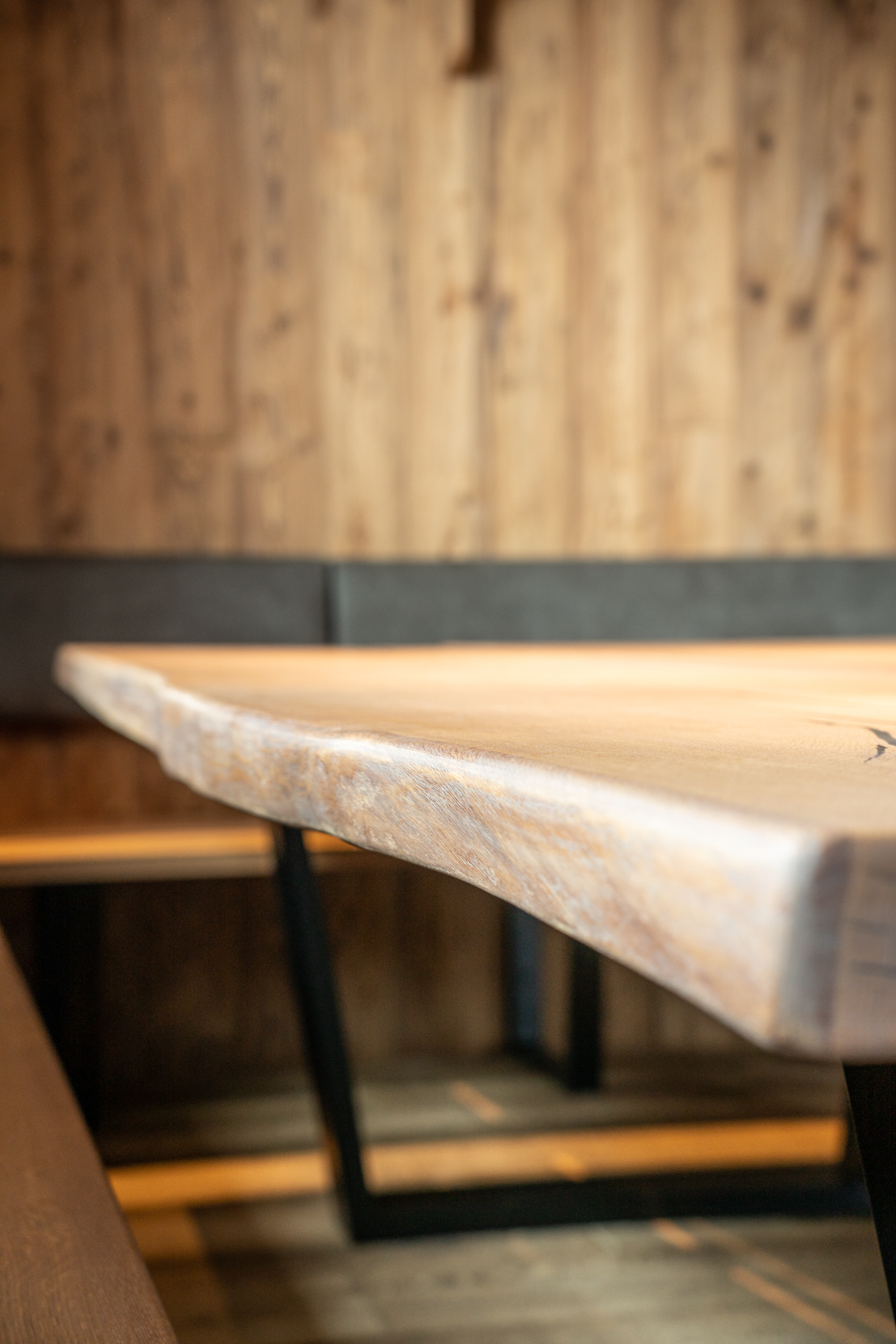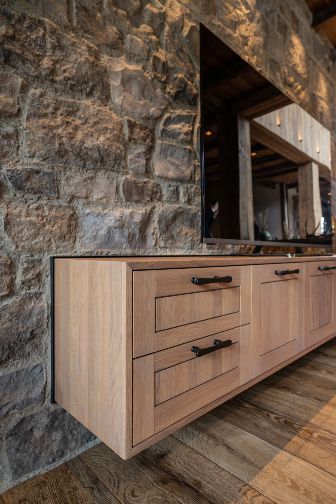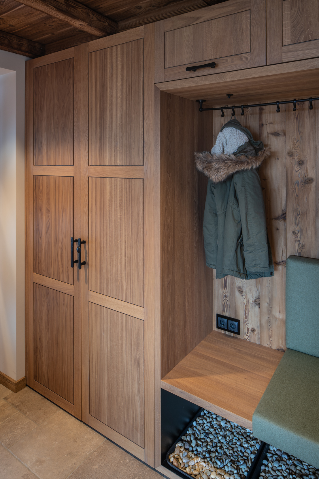 Wandverkleidungen aus gedämpfter Fichte geben dem Jagdhaus seine warme, ursprüngliche Ausstrahlung. Möbel aus geöltem Eiche-Vollholz und geschmiedete Beschläge verstärken den urigen Charakter. Naturleder ergänzt die Räume mit weicher Haptik. Ein Rückzugsort, der Geborgenheit schenkt und die Nähe zur Natur spürbar macht.
