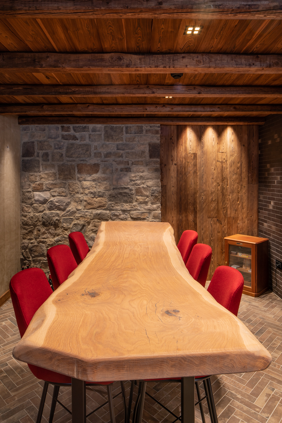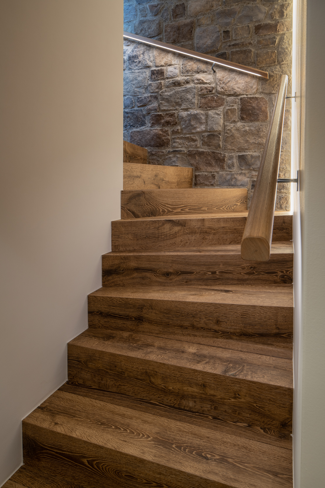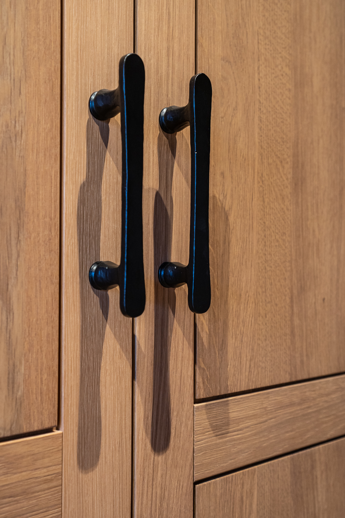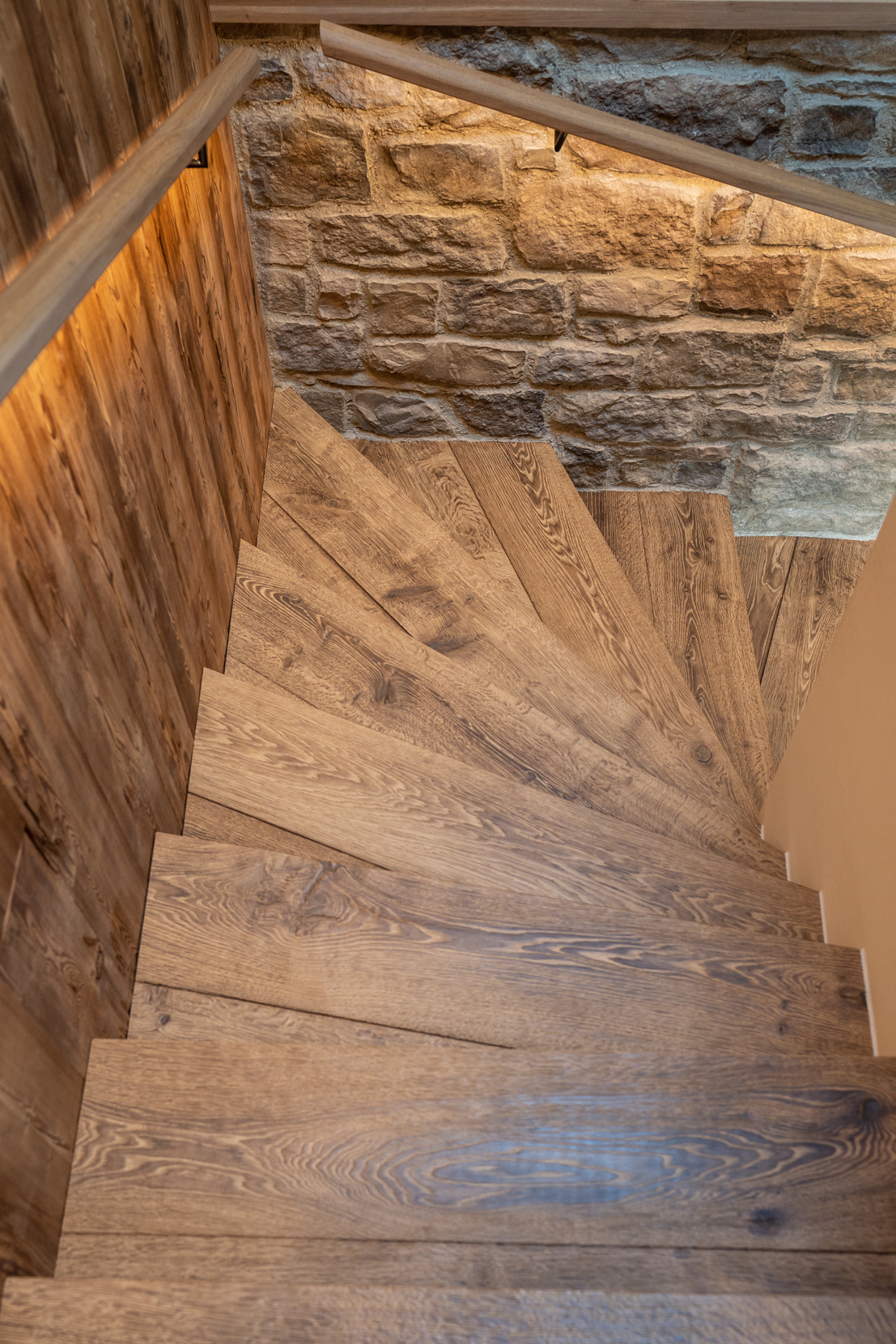 Wandverkleidungen aus gedämpfter Fichte geben dem Jagdhaus seine warme, ursprüngliche Ausstrahlung. Möbel aus geöltem Eiche-Vollholz und geschmiedete Beschläge verstärken den urigen Charakter. Naturleder ergänzt die Räume mit weicher Haptik. Ein Rückzugsort, der Geborgenheit schenkt und die Nähe zur Natur spürbar macht.