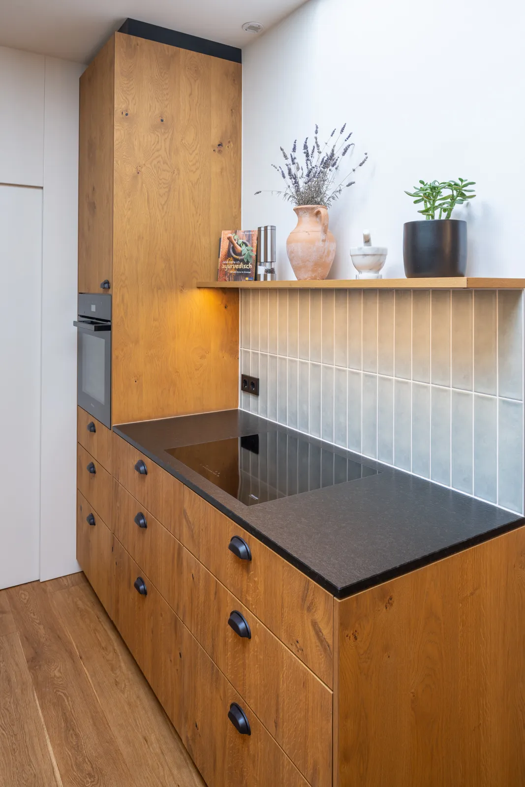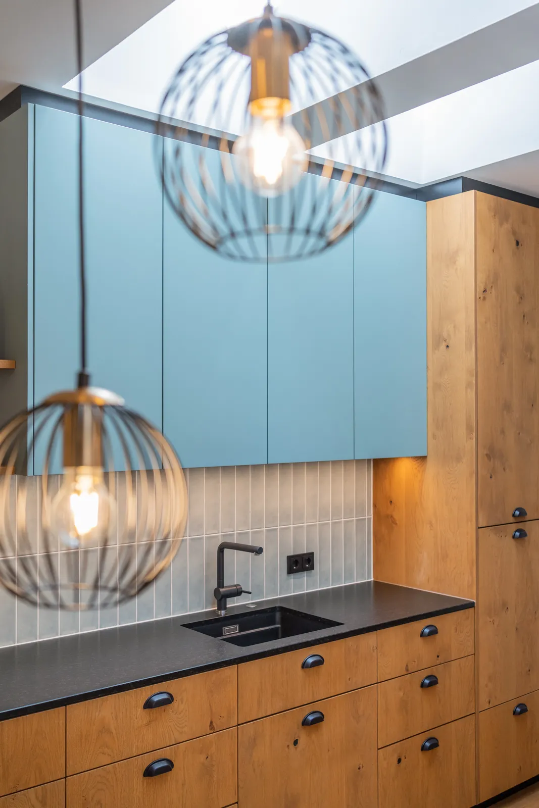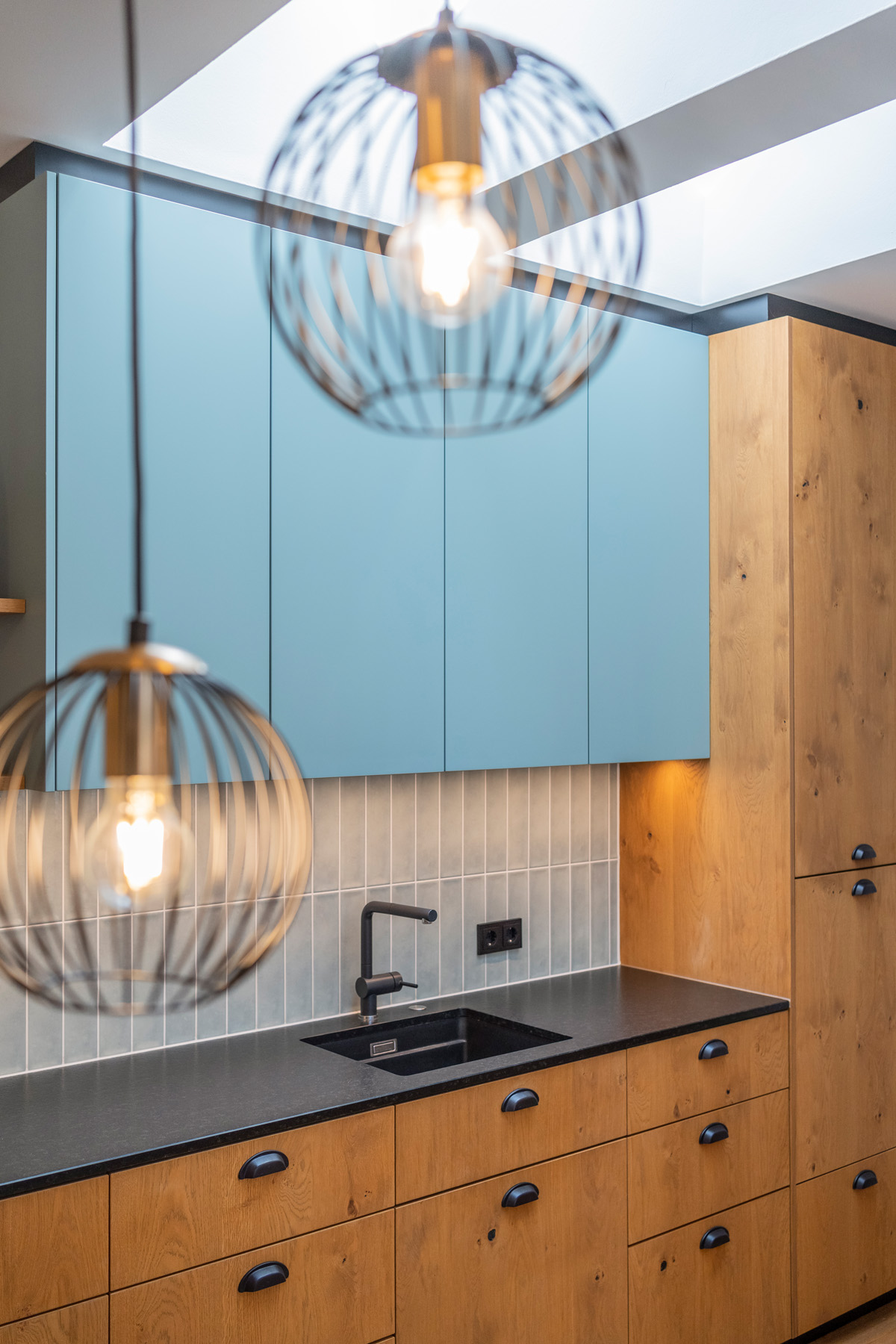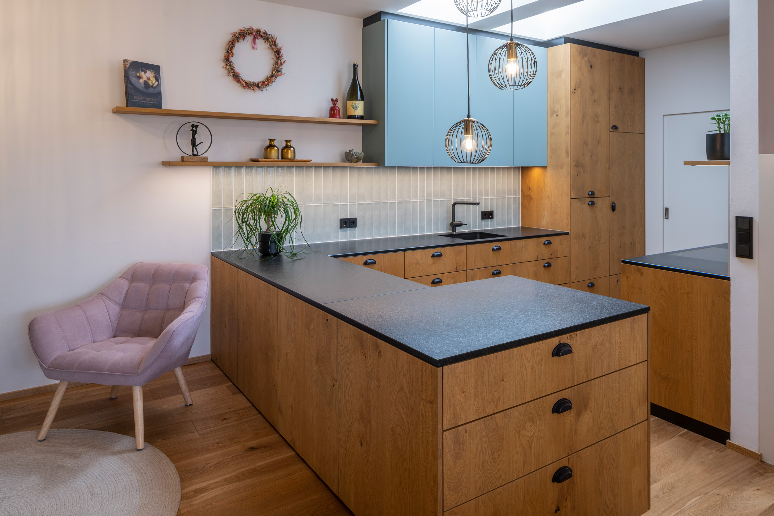 Braun geölte Eiche trifft auf matt blaue Fronten. Schwarze Muschelgriffe und eine dunkle Arbeitsplatte setzen klare Akzente. Die Mischung aus warmem Holz und sanfter Farbe verleiht der Küche eine freundliche, wohnliche Ausstrahlung.