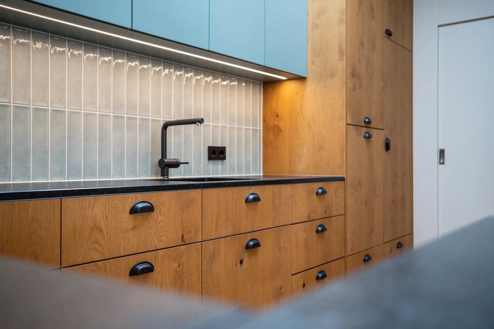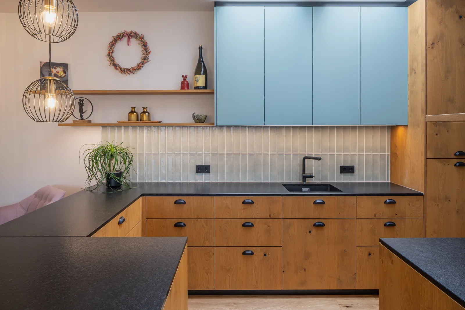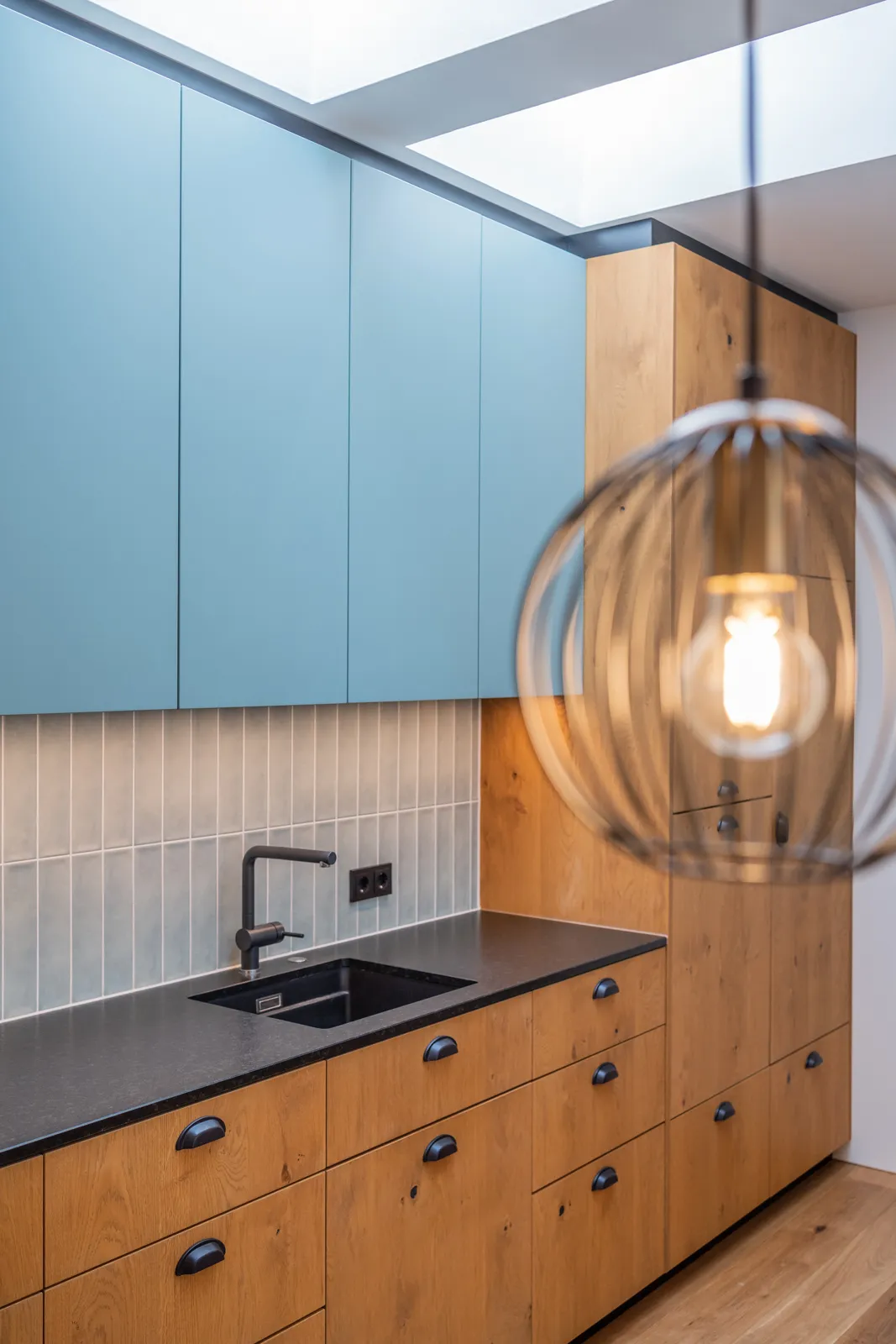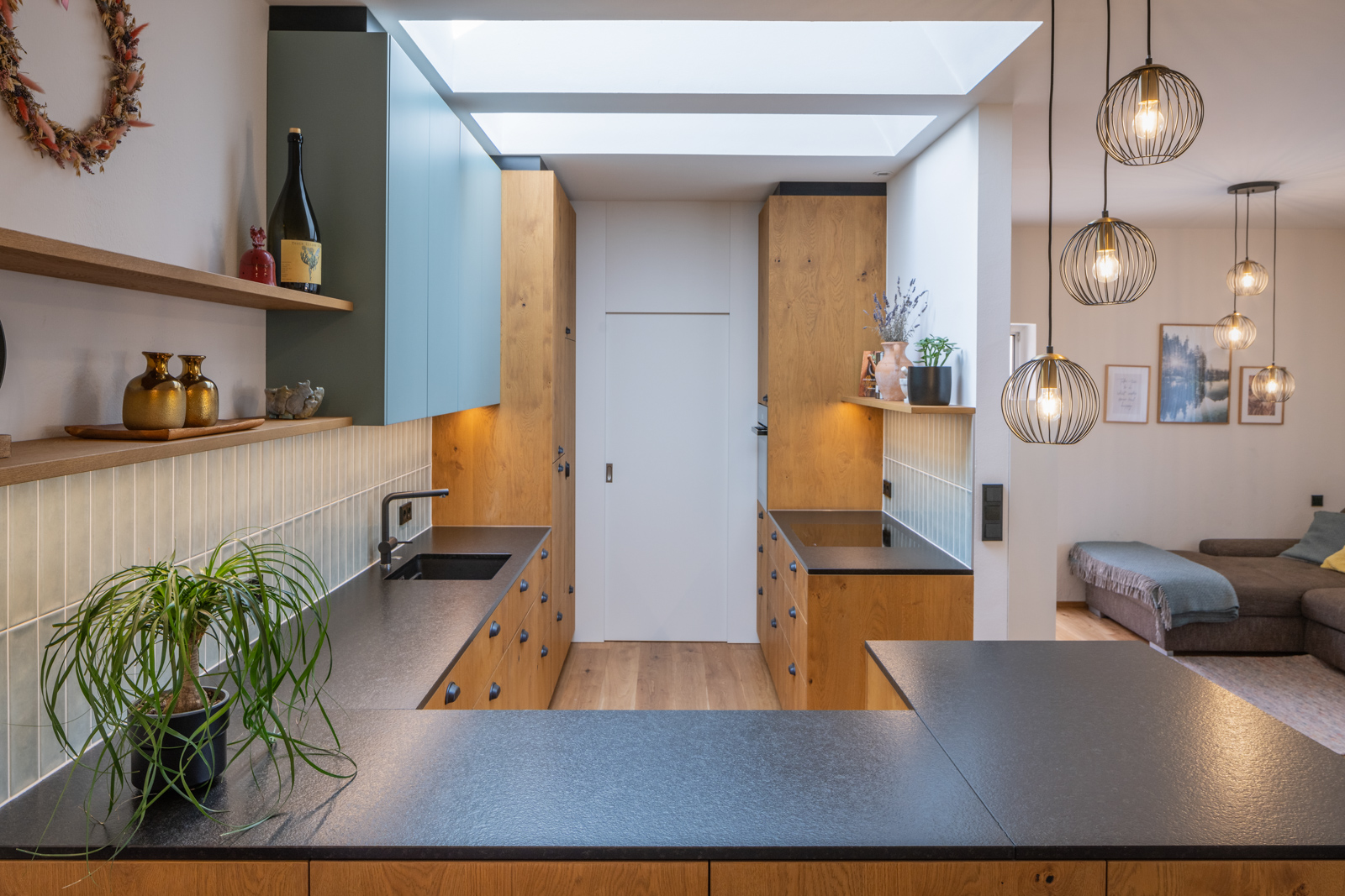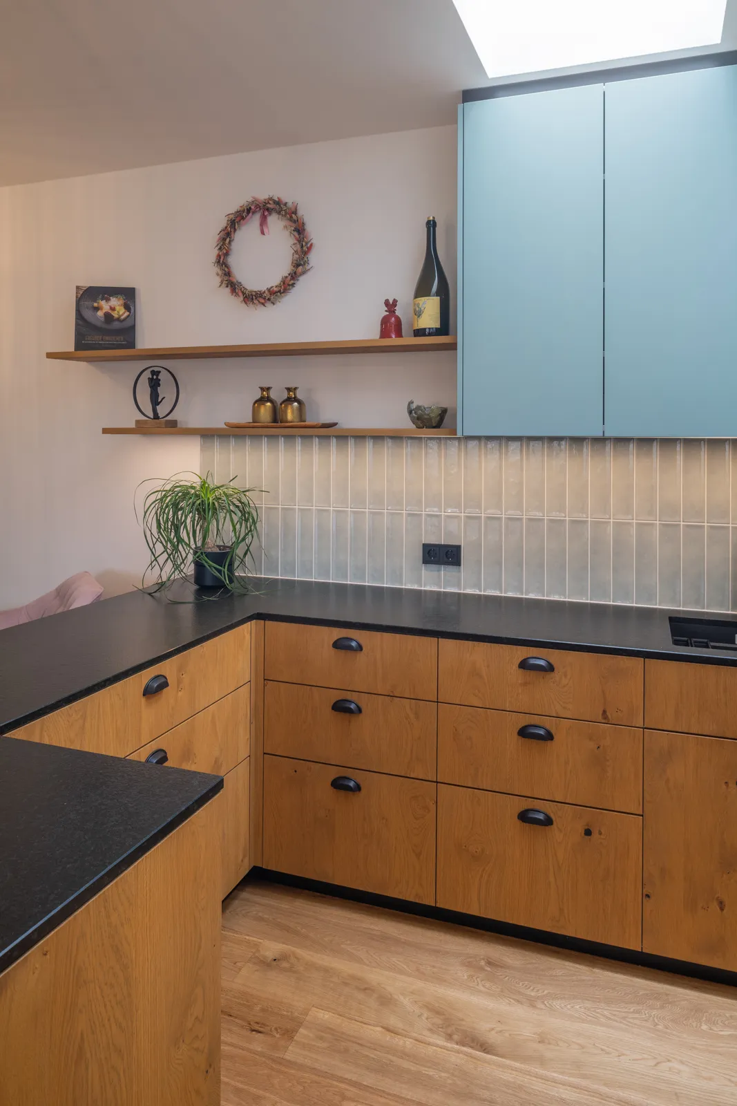 Braun geölte Eiche trifft auf matt blaue Fronten. Schwarze Muschelgriffe und eine dunkle Arbeitsplatte setzen klare Akzente. Die Mischung aus warmem Holz und sanfter Farbe verleiht der Küche eine freundliche, wohnliche Ausstrahlung.