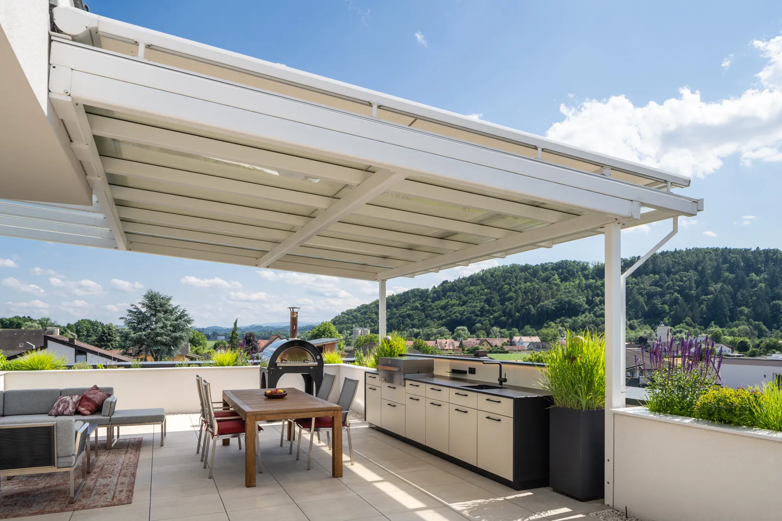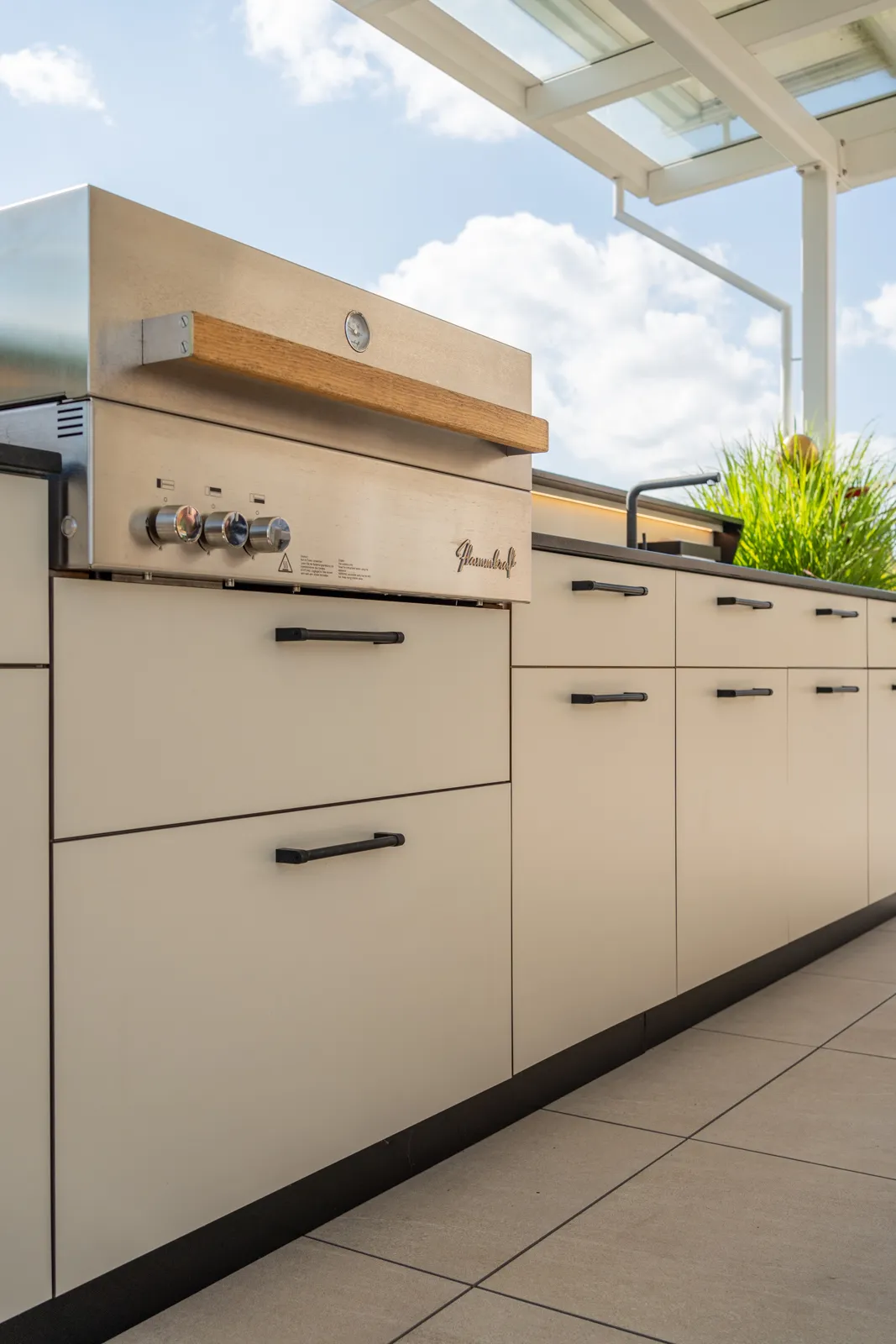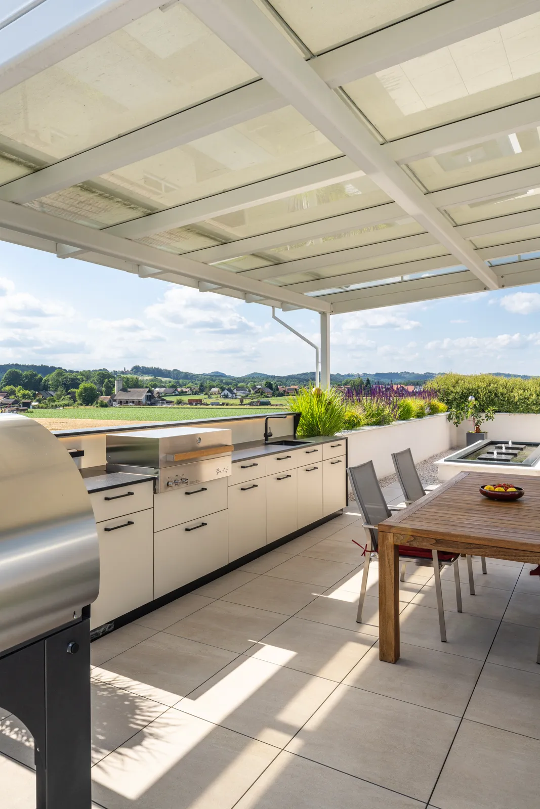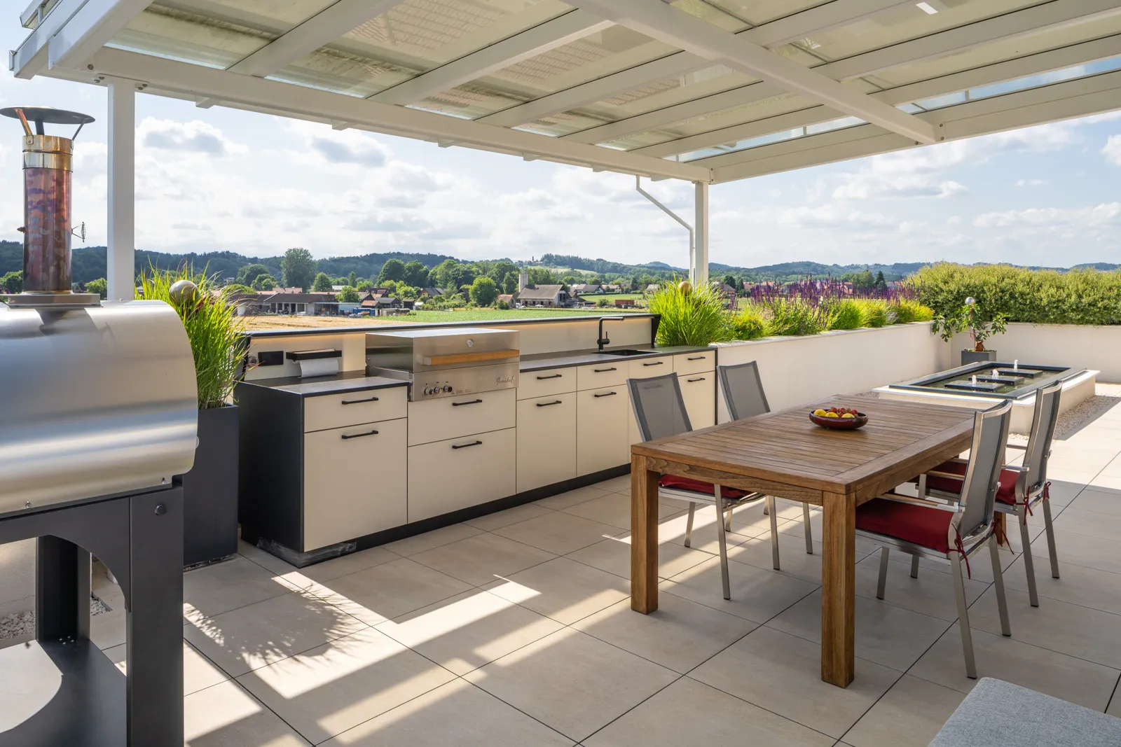 Kochen mit Weitblick – die Aussicht begleitet jeden Handgriff. Der Flammkraft sorgt für kulinarische Höhepunkte, das Waschbecken für Komfort im Alltag. Eine magnetische Rückwand hält Küchenrolle und Utensilien stets griffbereit. Der Baraufsatz mit integriertem Licht verwandelt die Küche in einen stimmungsvollen Treffpunkt für Familie und Freunde.
