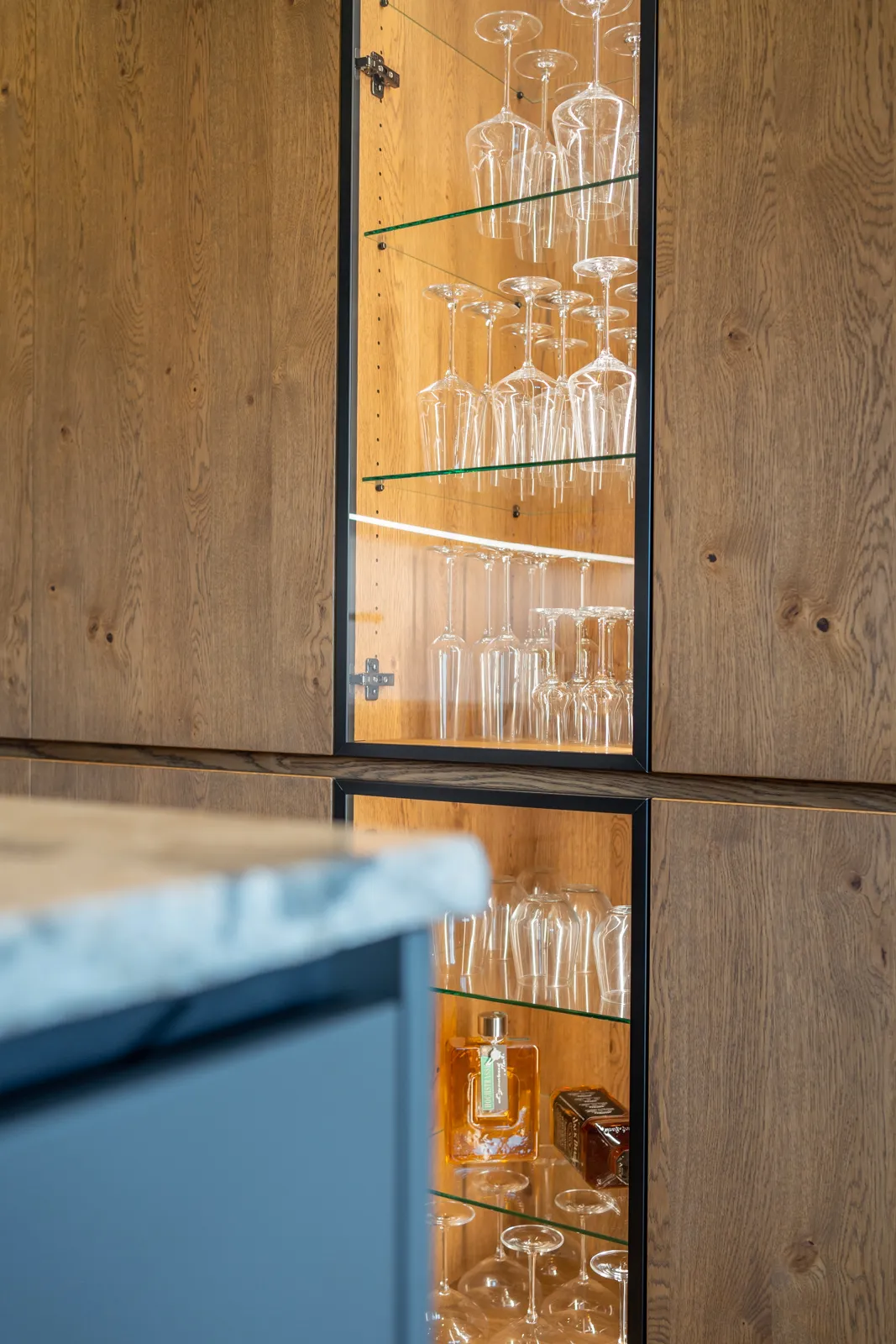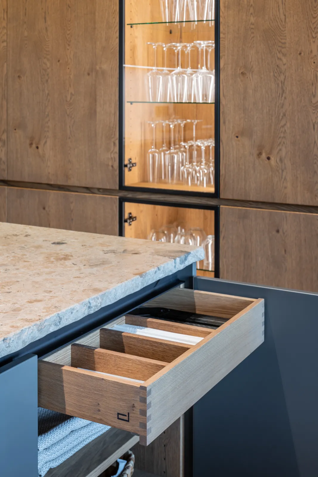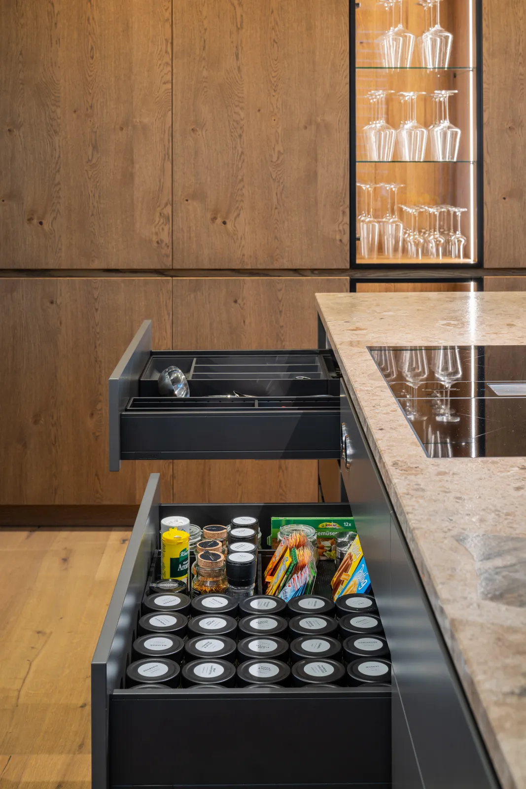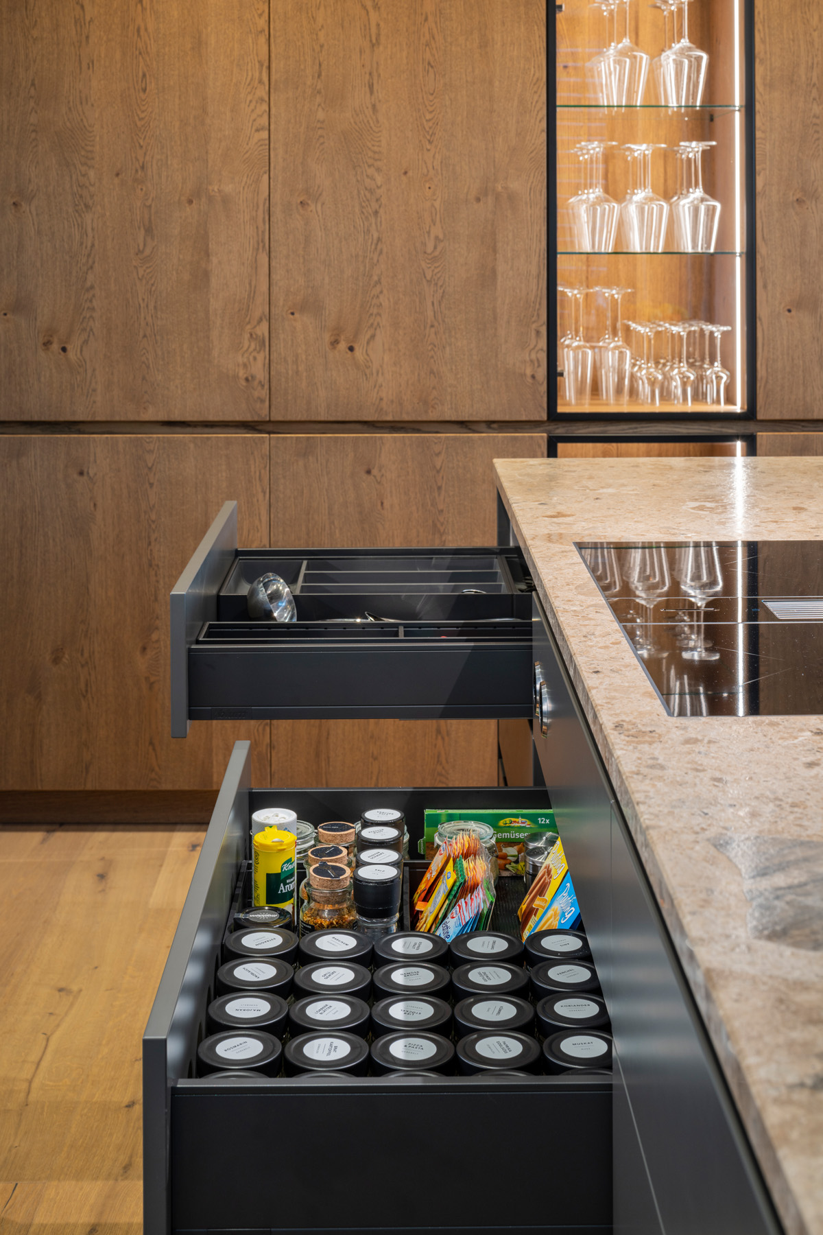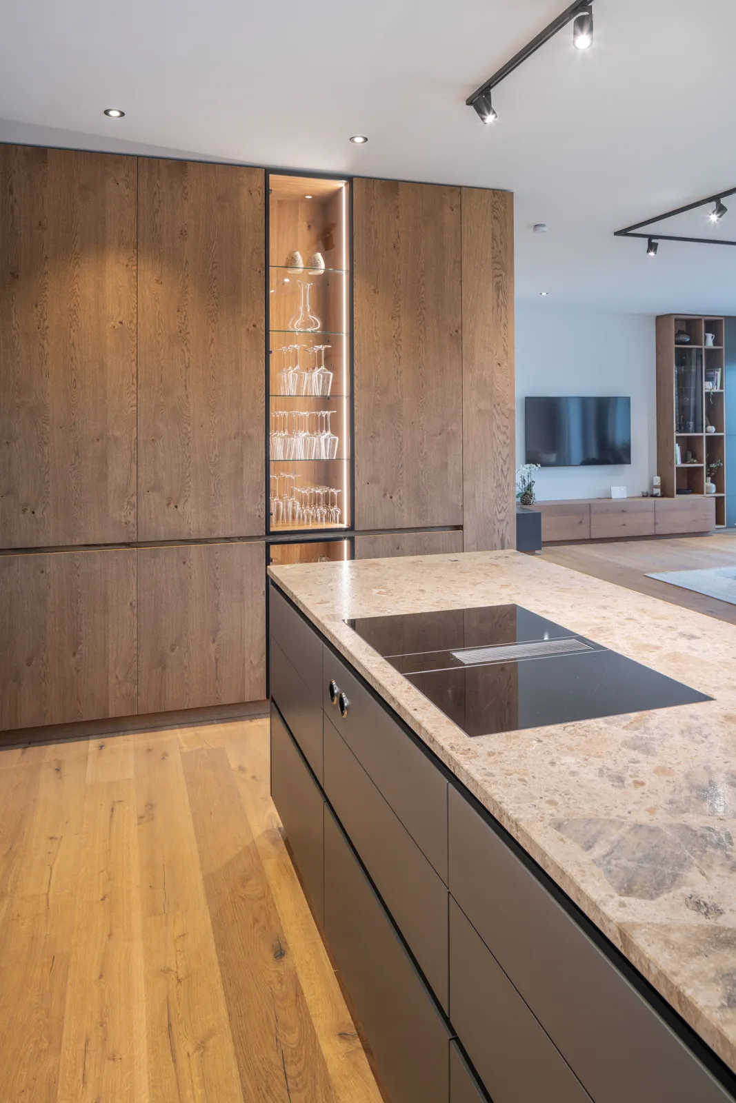 Als durchgängiges Gestaltungselement prägt die braun geölte Eiche das Gesamtkonzept. In Kombination mit matt lackierten Fronten, dem hellen Naturstein Cheppo Beige und Naturleder entfaltet sich ein harmonisches Zusammenspiel von Beständigkeit, handwerklicher Präzision und wohnlicher Ruhe.