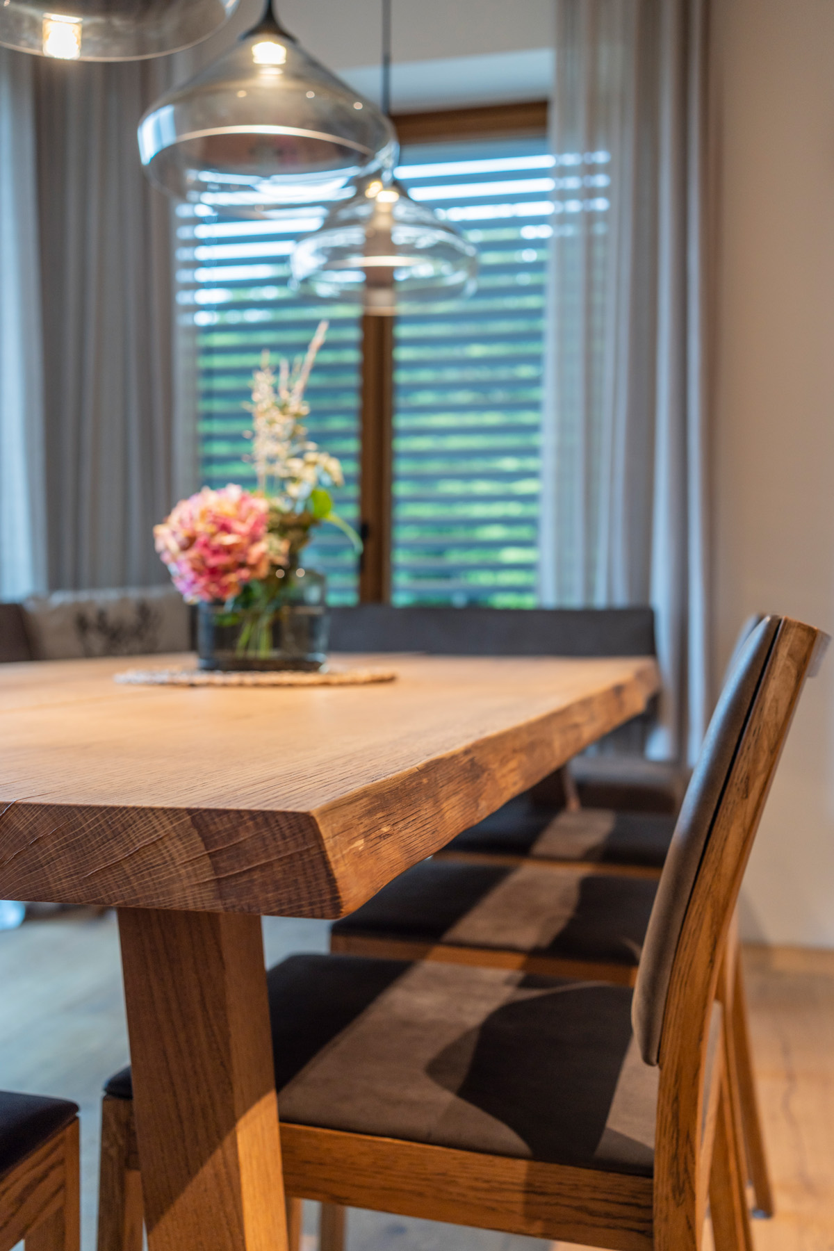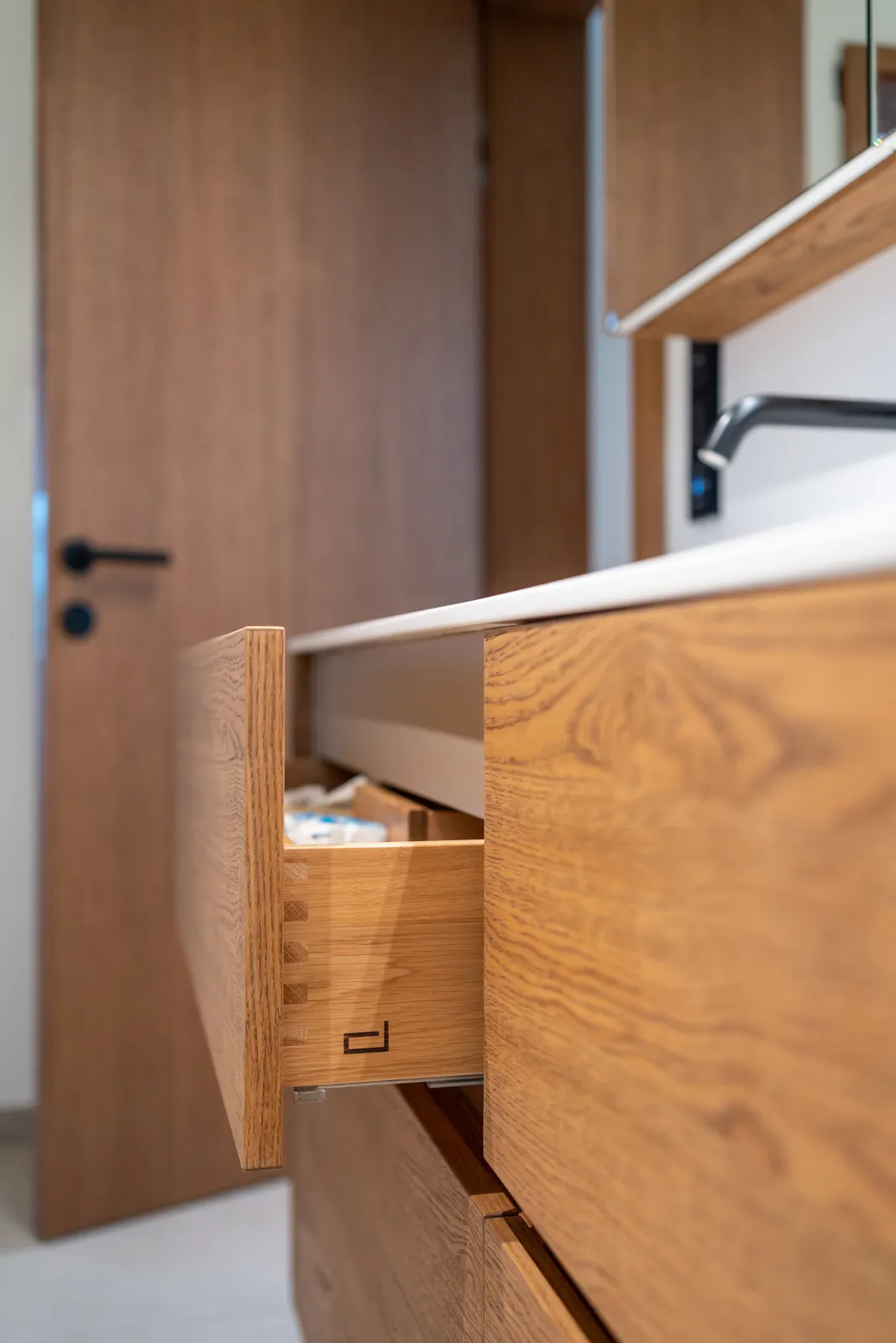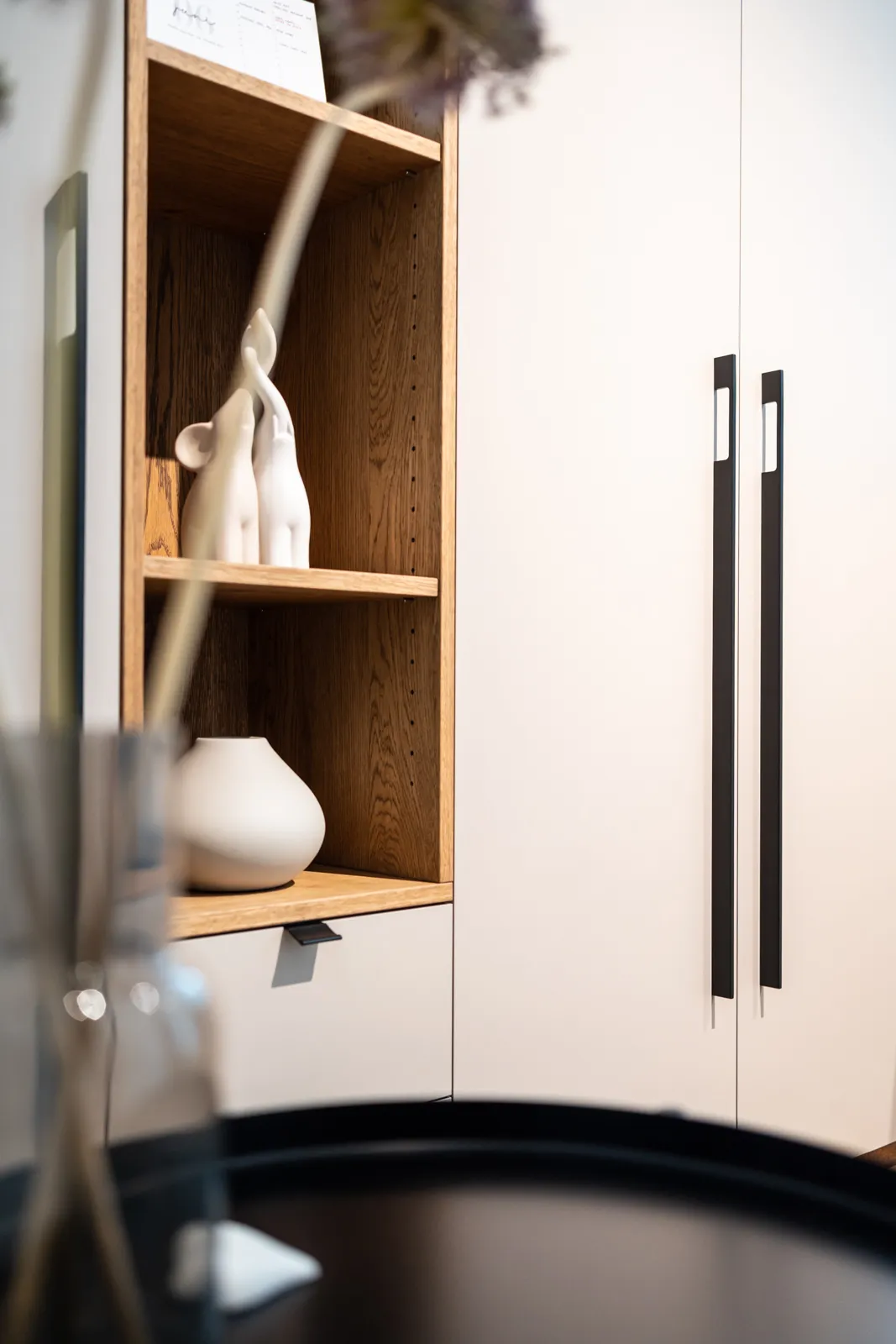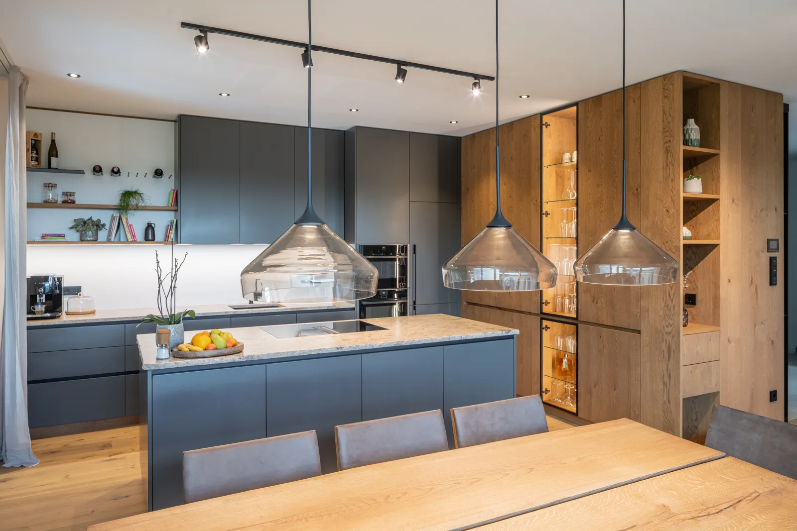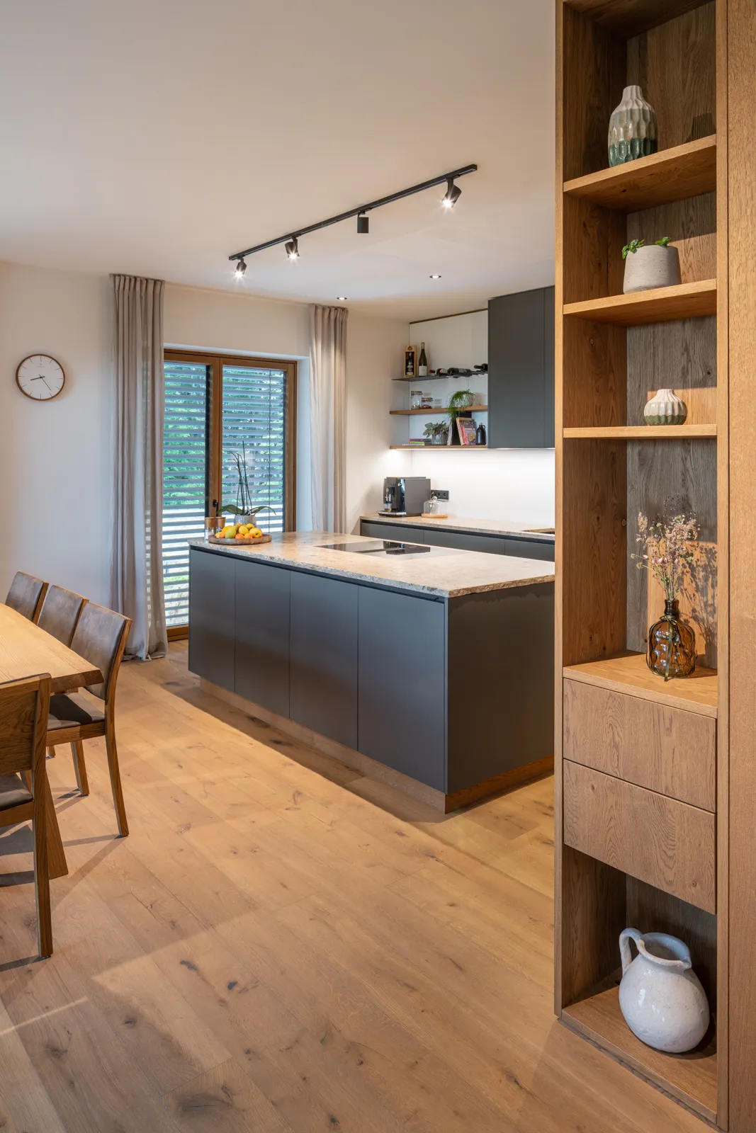 Als durchgängiges Gestaltungselement prägt die braun geölte Eiche das Gesamtkonzept. In Kombination mit matt lackierten Fronten, dem hellen Naturstein Cheppo Beige und Naturleder entfaltet sich ein harmonisches Zusammenspiel von Beständigkeit, handwerklicher Präzision und wohnlicher Ruhe.