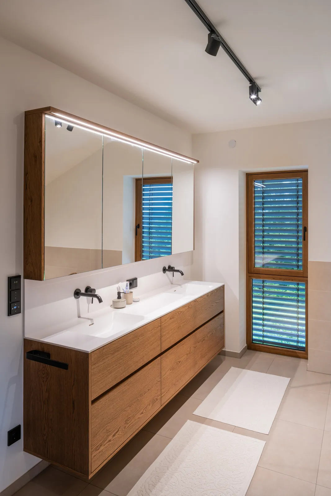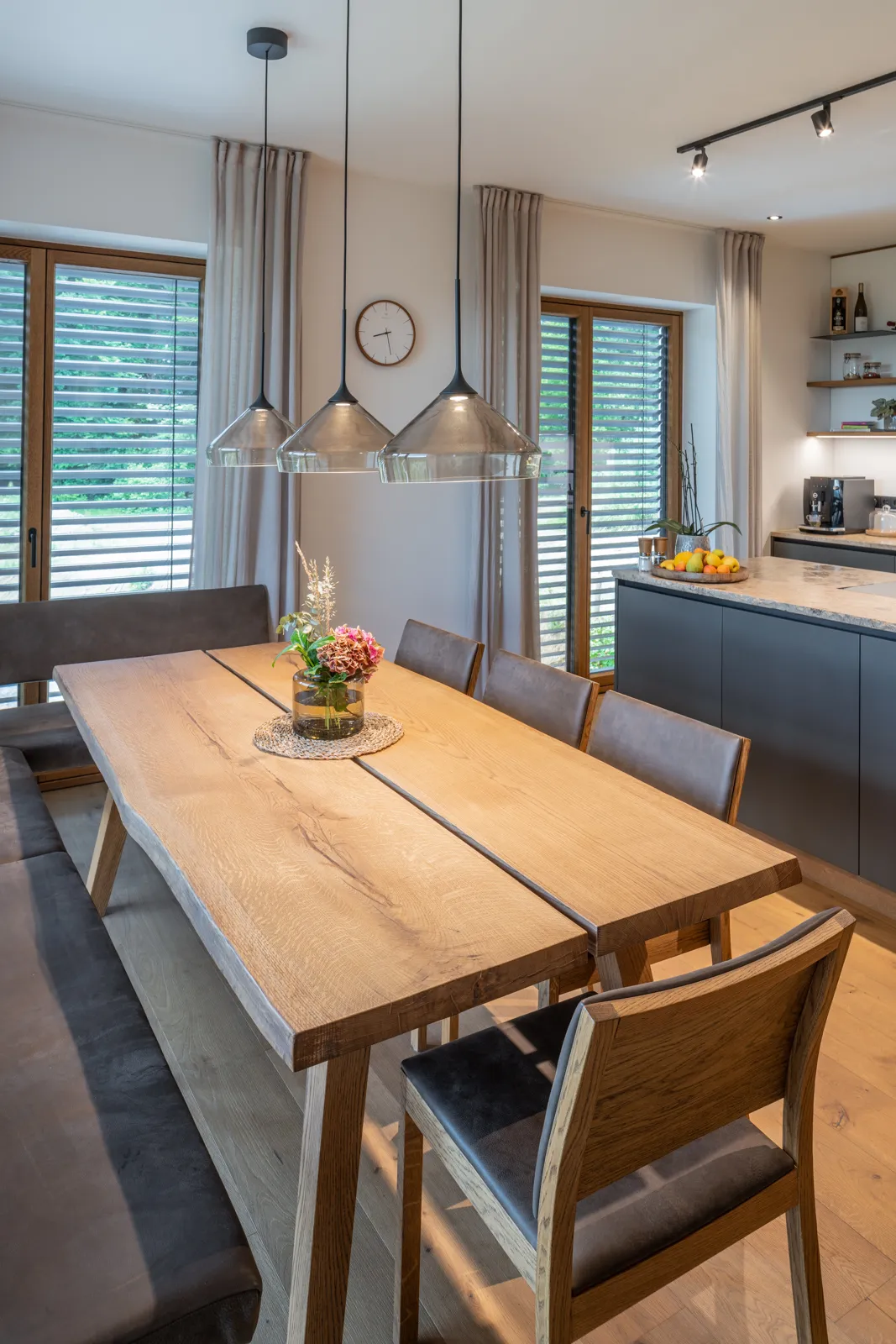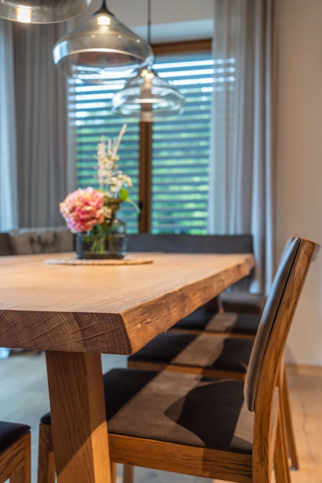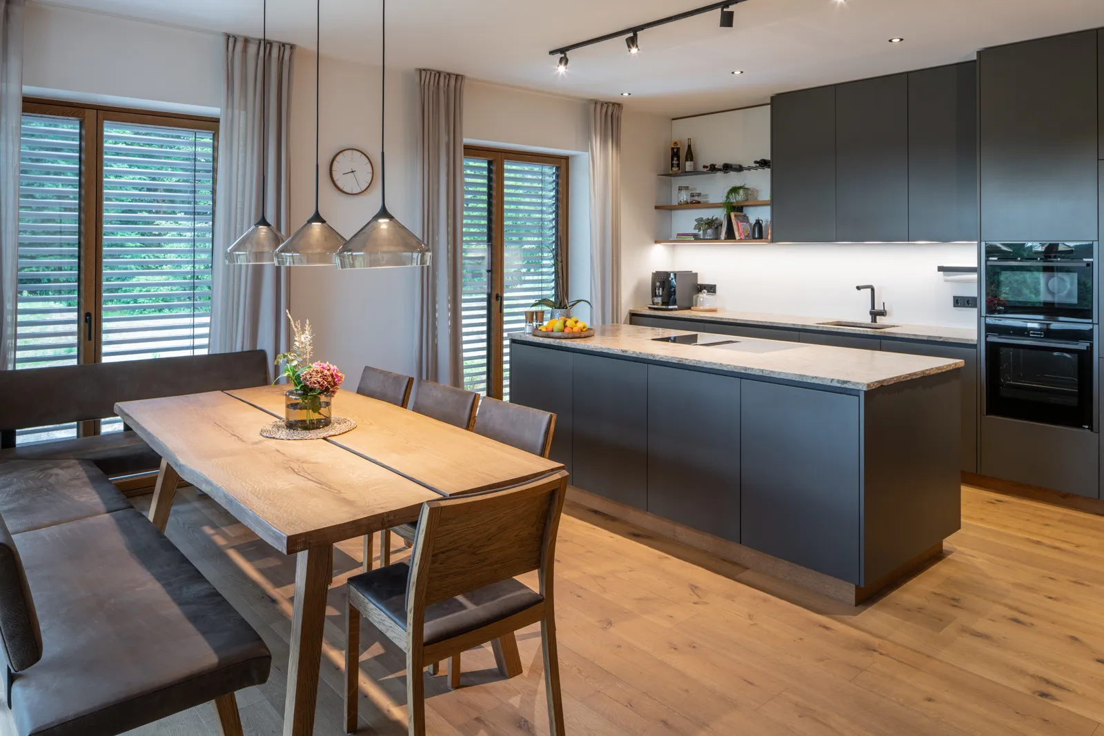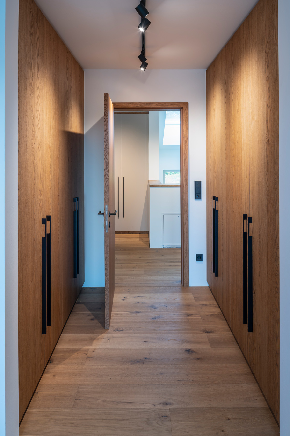 Als durchgängiges Gestaltungselement prägt die braun geölte Eiche das Gesamtkonzept. In Kombination mit matt lackierten Fronten, dem hellen Naturstein Cheppo Beige und Naturleder entfaltet sich ein harmonisches Zusammenspiel von Beständigkeit, handwerklicher Präzision und wohnlicher Ruhe.