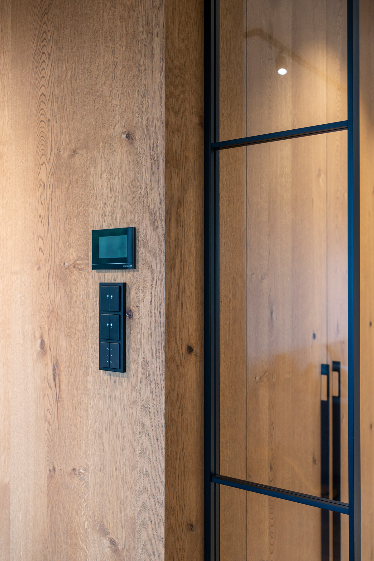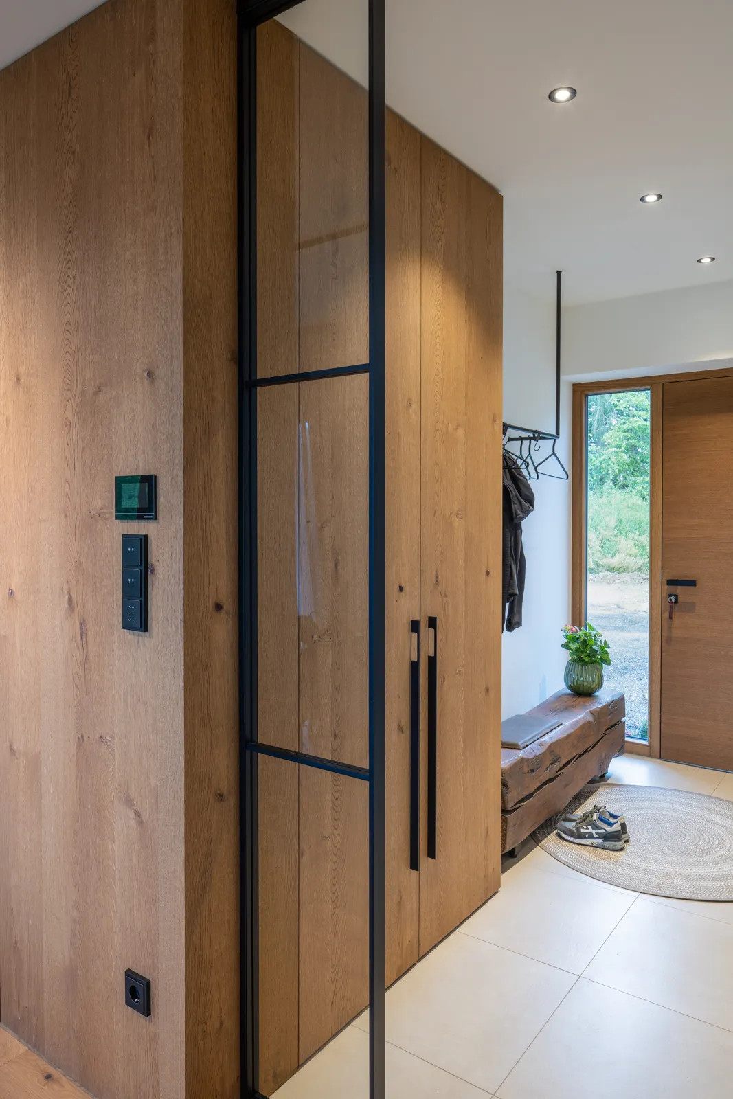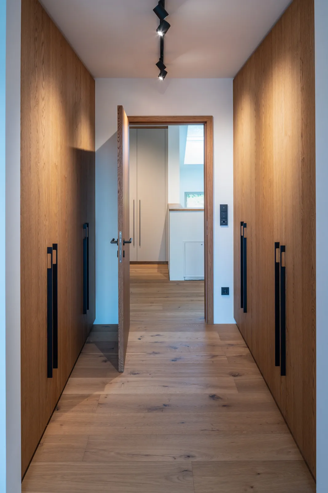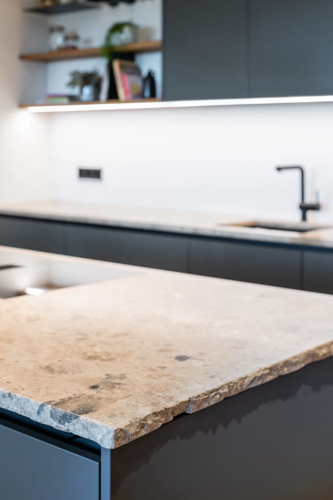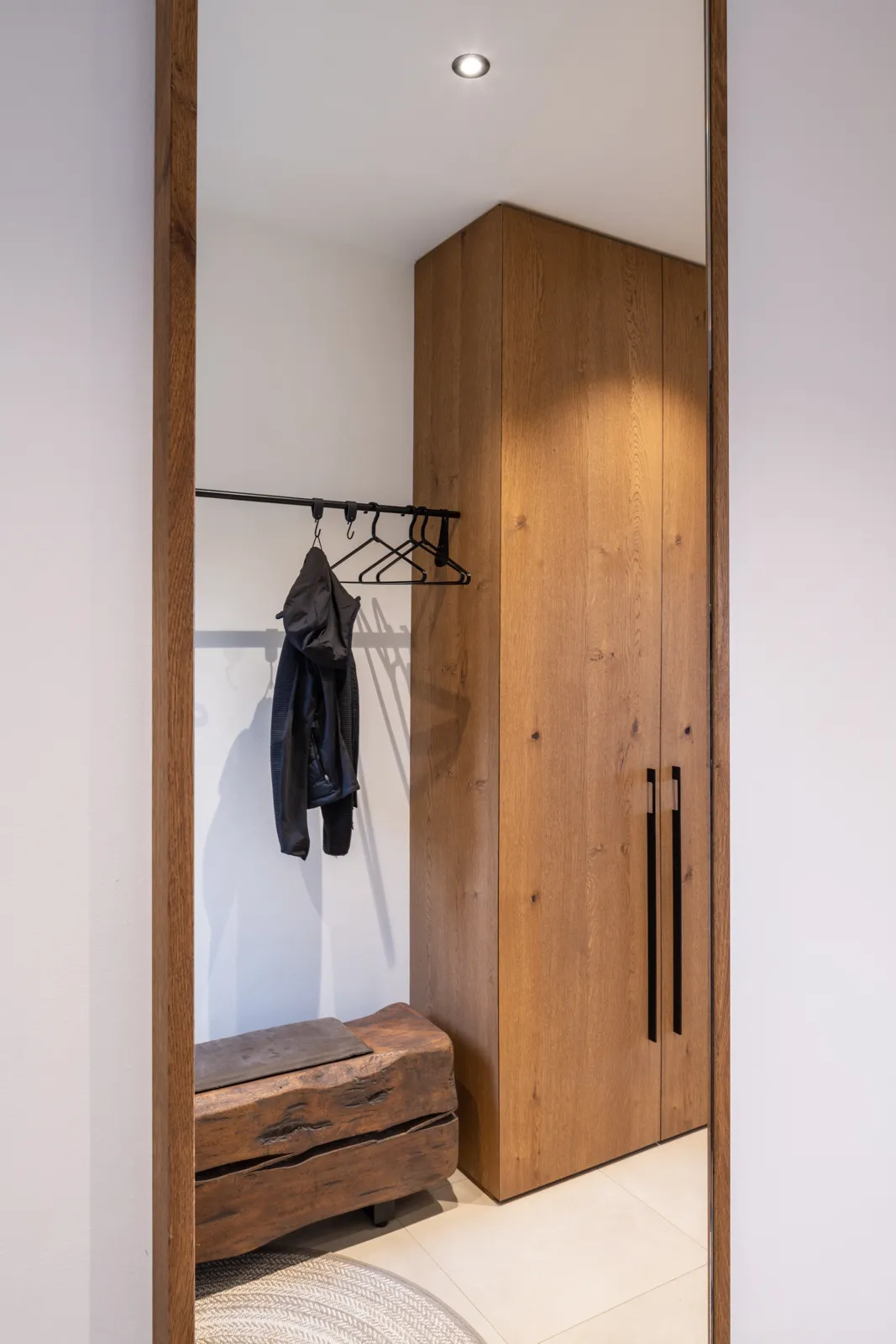 Als durchgängiges Gestaltungselement prägt die braun geölte Eiche das Gesamtkonzept. In Kombination mit matt lackierten Fronten, dem hellen Naturstein Cheppo Beige und Naturleder entfaltet sich ein harmonisches Zusammenspiel von Beständigkeit, handwerklicher Präzision und wohnlicher Ruhe.