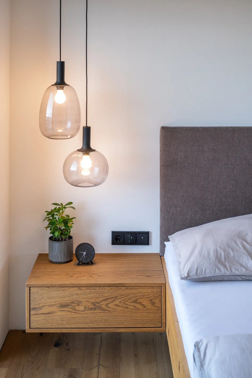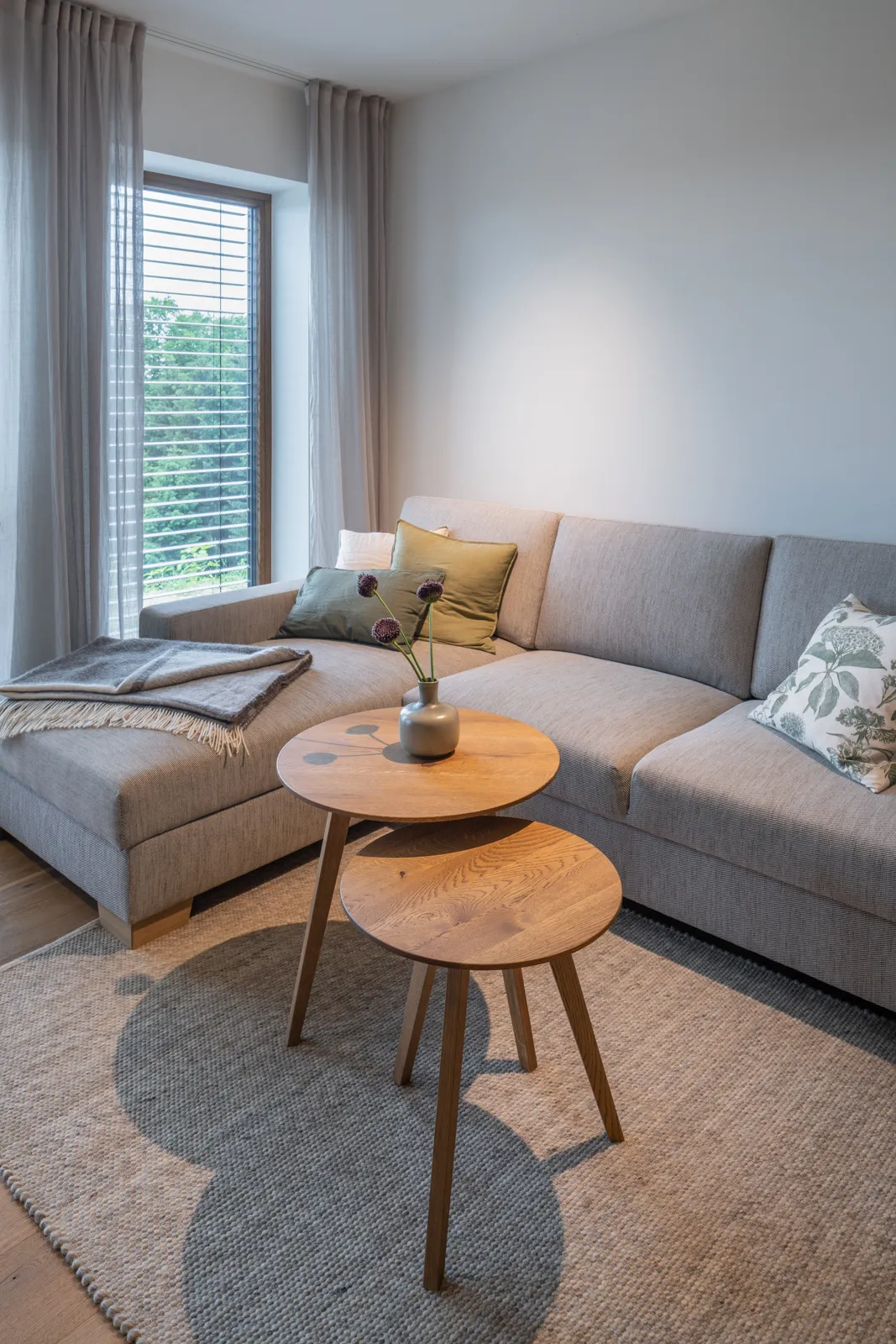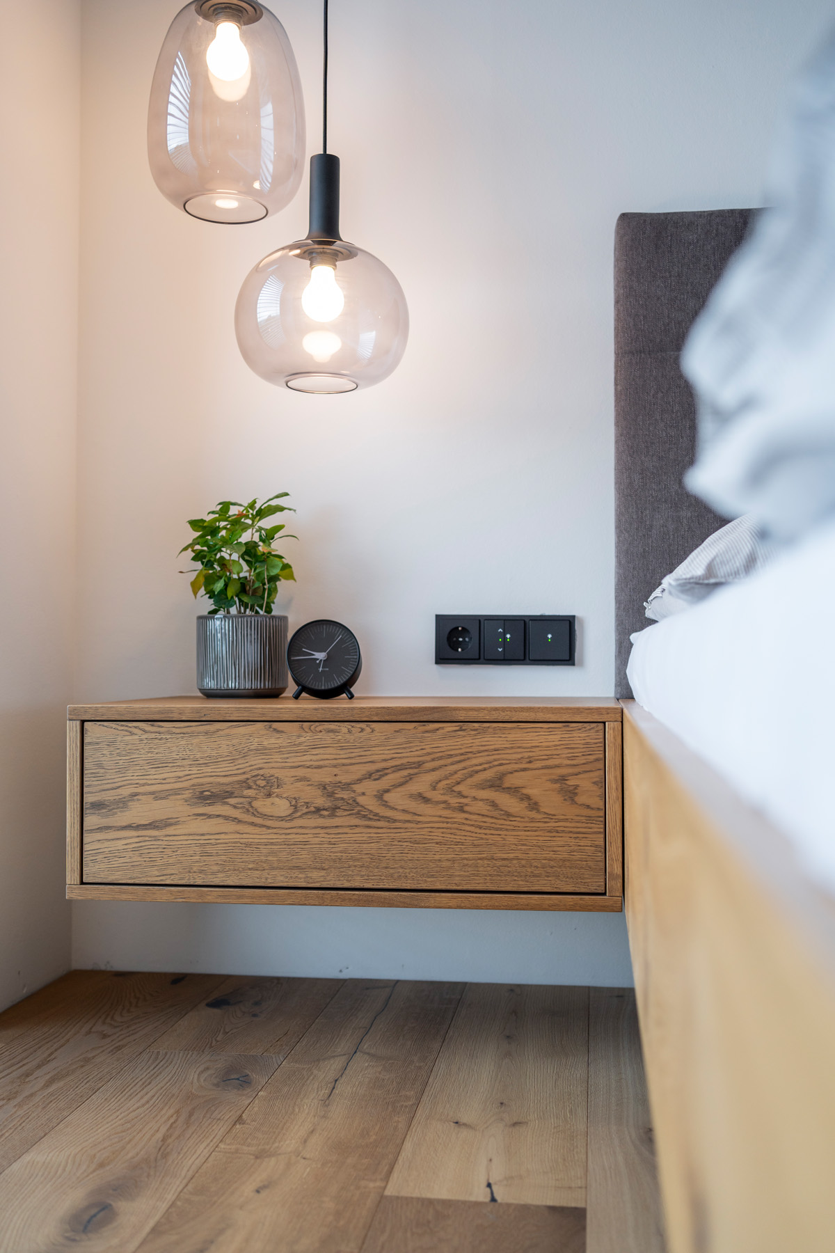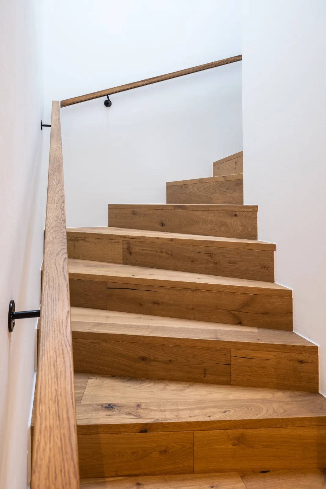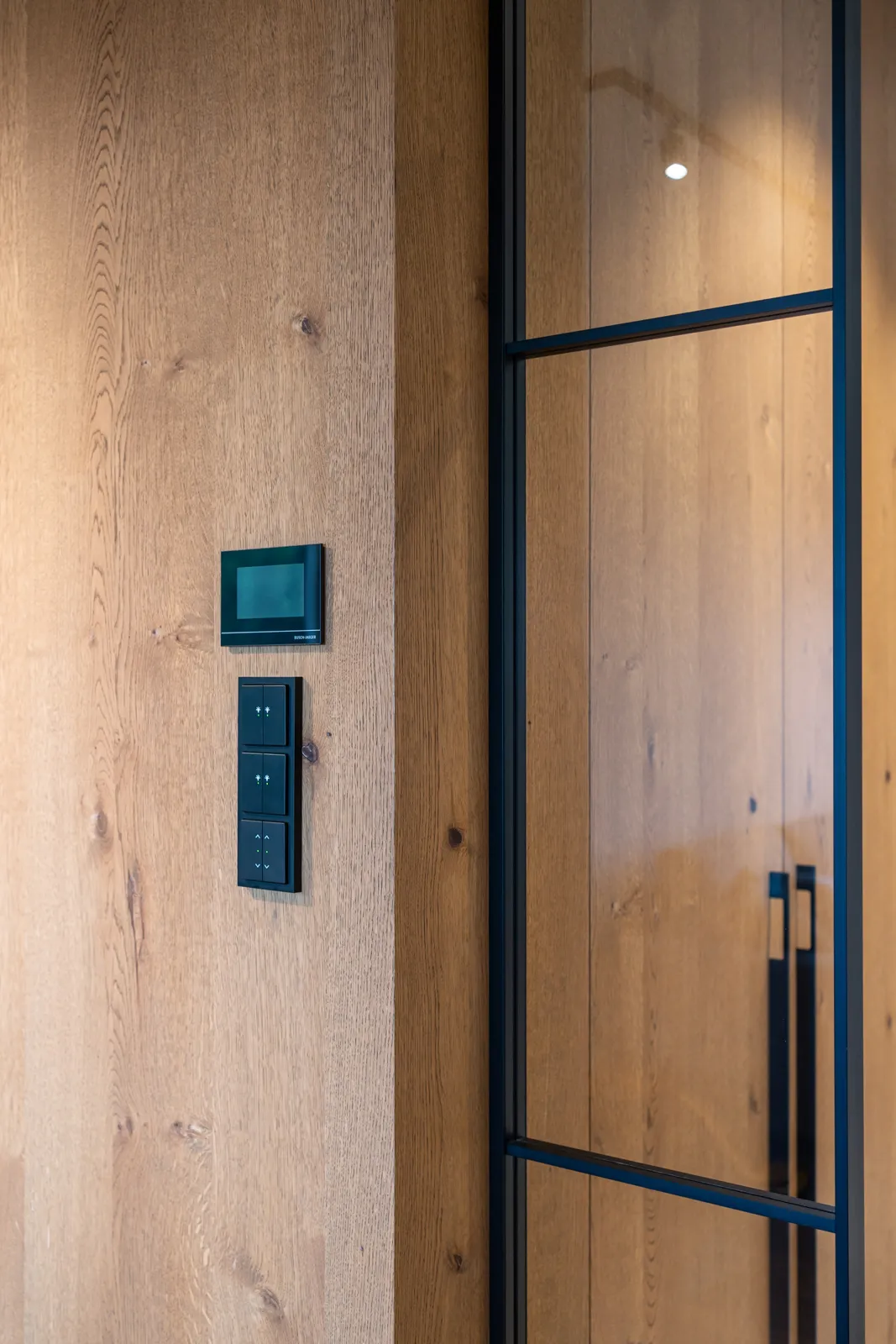 Als durchgängiges Gestaltungselement prägt die braun geölte Eiche das Gesamtkonzept. In Kombination mit matt lackierten Fronten, dem hellen Naturstein Cheppo Beige und Naturleder entfaltet sich ein harmonisches Zusammenspiel von Beständigkeit, handwerklicher Präzision und wohnlicher Ruhe.